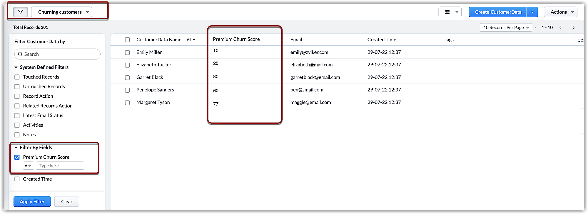 - If you'd like to know how many of your loyal customers are about to churn, you can set criteria based on their churn scores.
