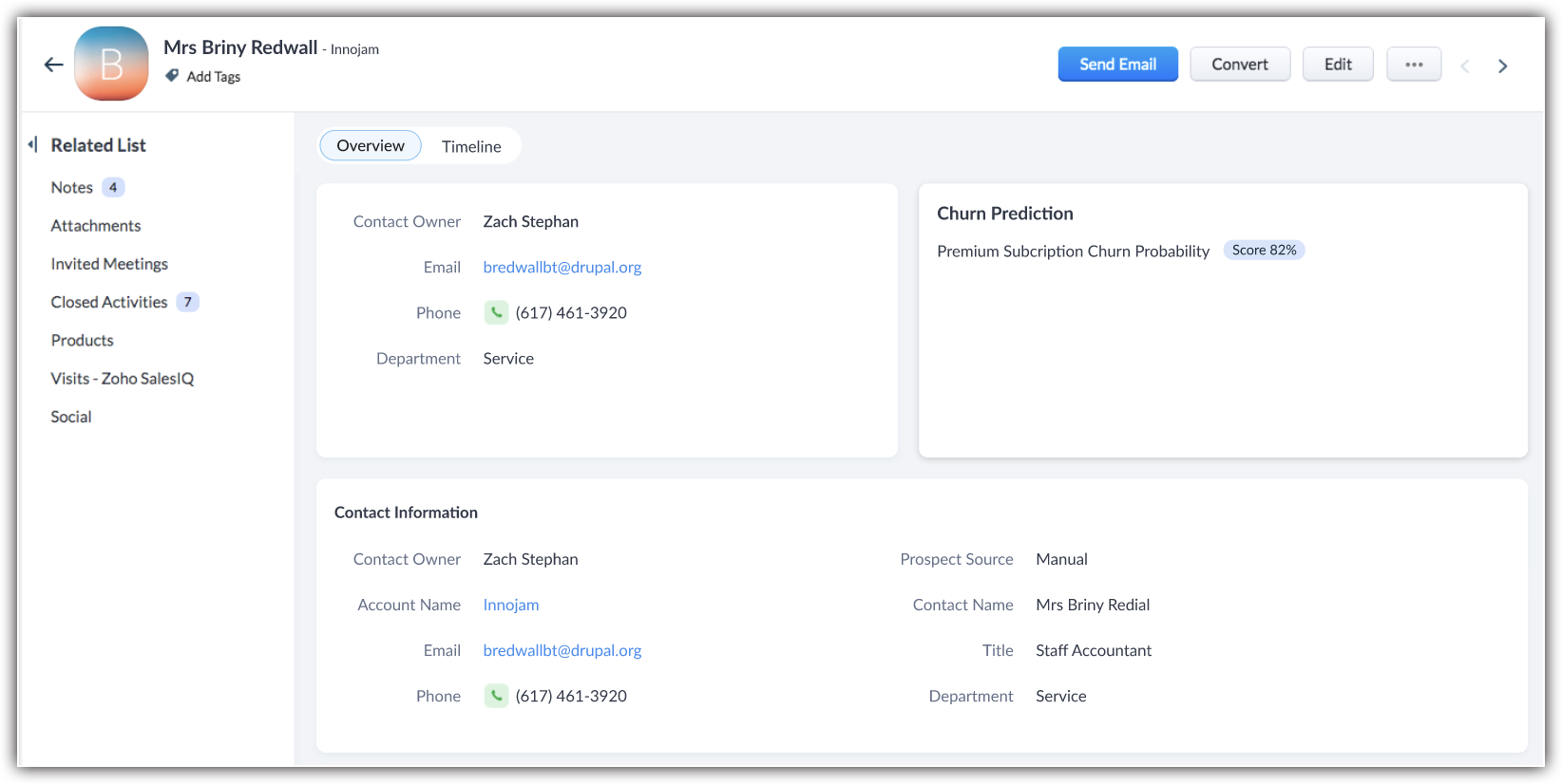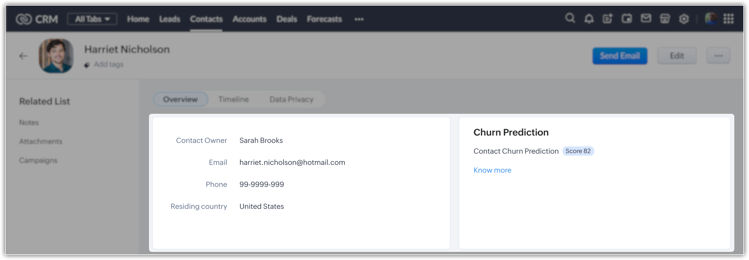 Churn prediction is an indicator of your business performance. You can use the field value of predicted score and product across CRM to perform different actions and derive different insights. Let's look at a few of them.