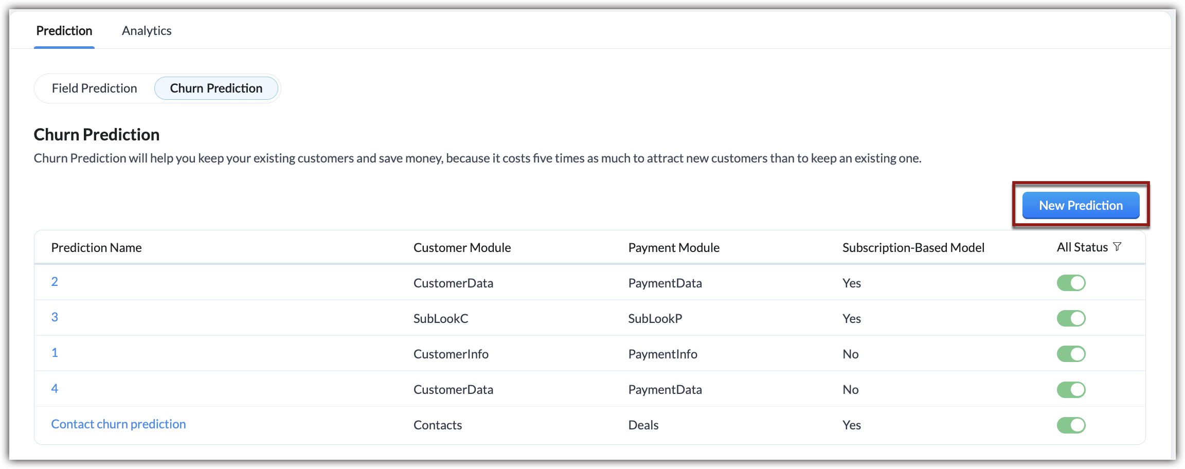 - To create a new churn configuration, click on the New Prediction button.