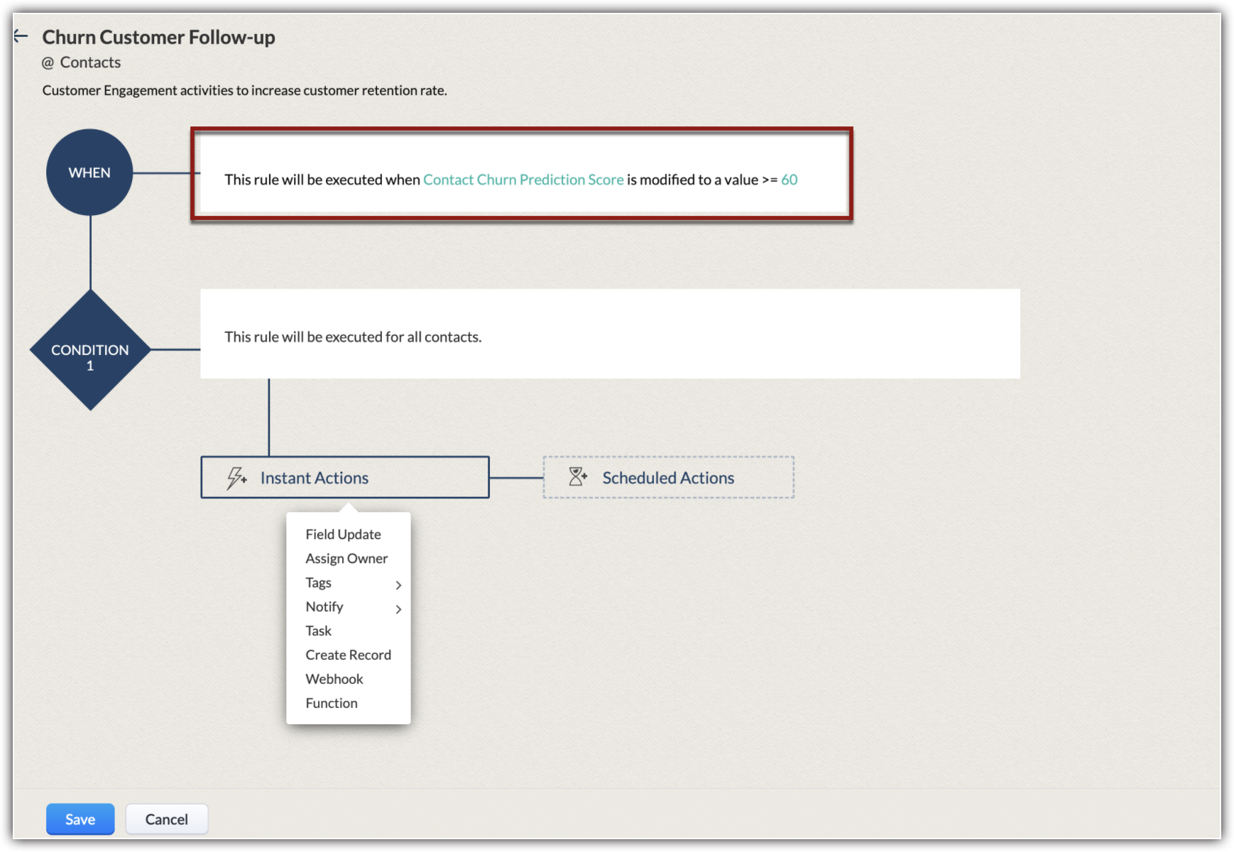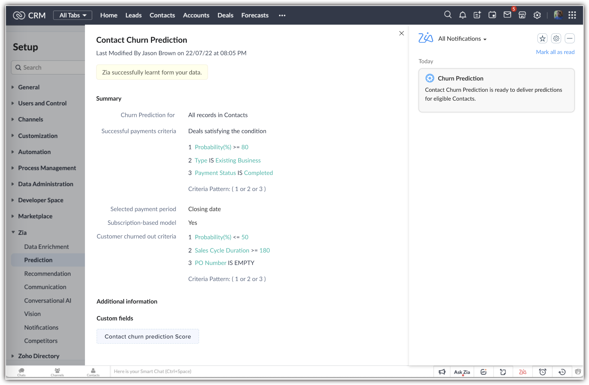 Act upon Zia churn predictions in Zoho CRM