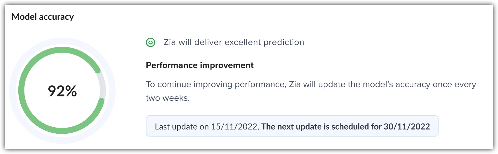 Model accuracy is a self-examination Zia does to assess how well it managed to learn the prediction pattern and is an indicator of prediction quality. The higher the score, the higher the predictive accuracy is going to be.