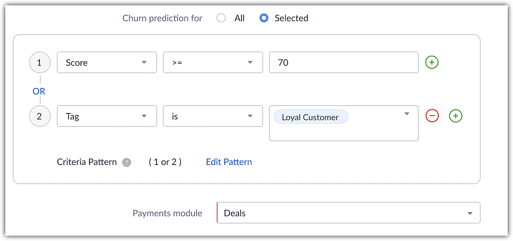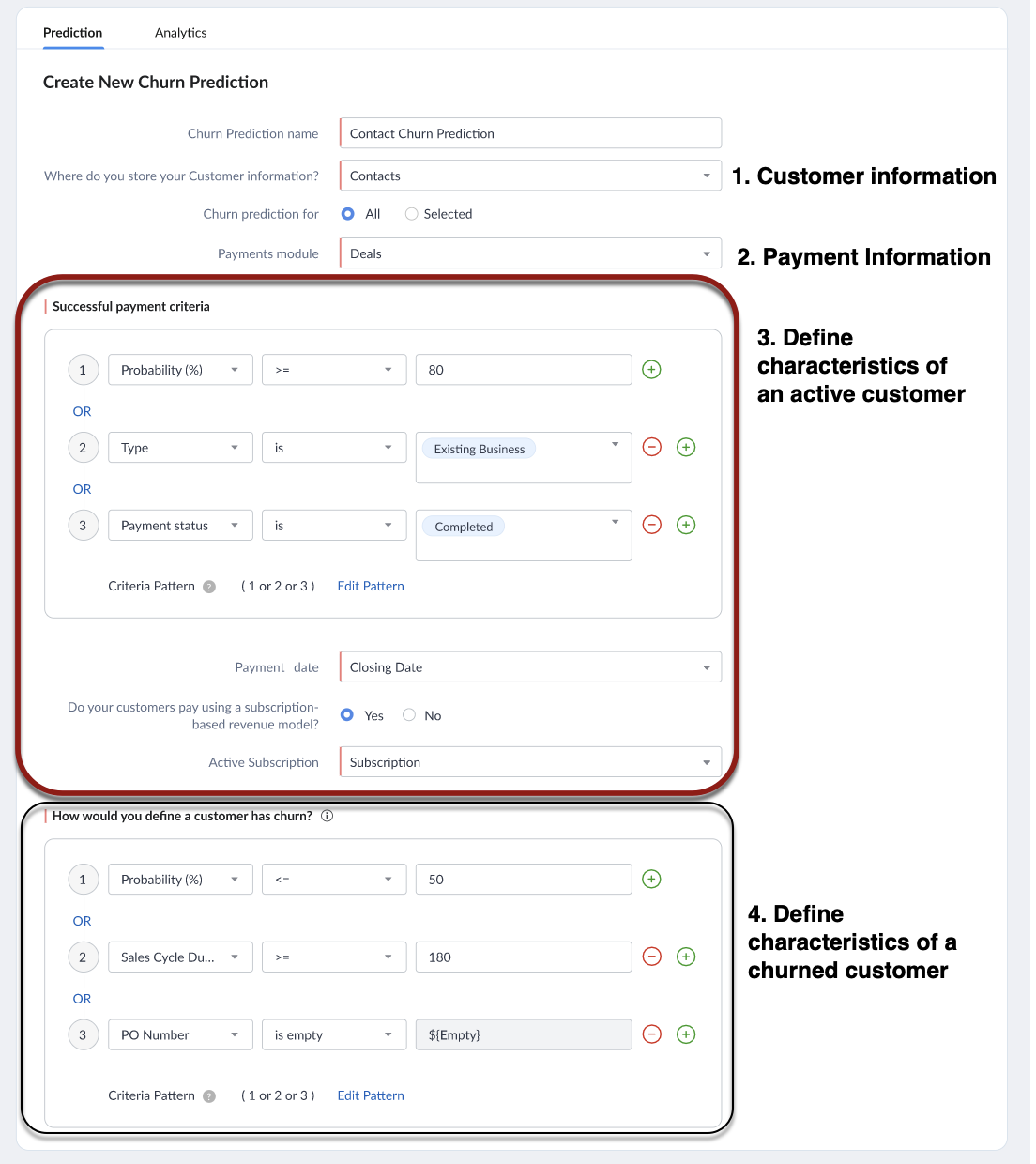 Specify criteria: You can apply prediction for all records in the customer module or only for specific records that satisfy the criteria.