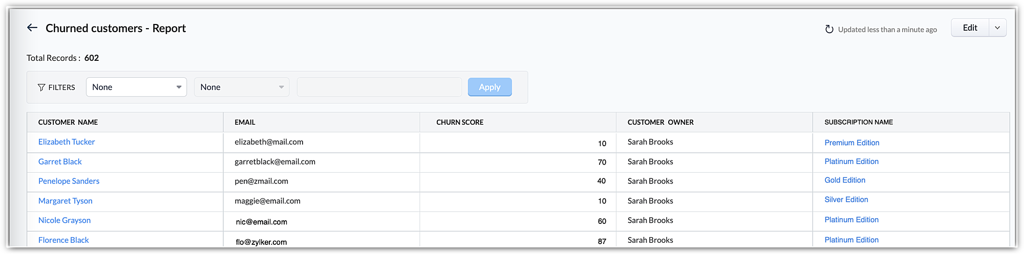- In Module views and advanced filters, to sort churning customers from the rest of the customer base and tend to them with more attention.