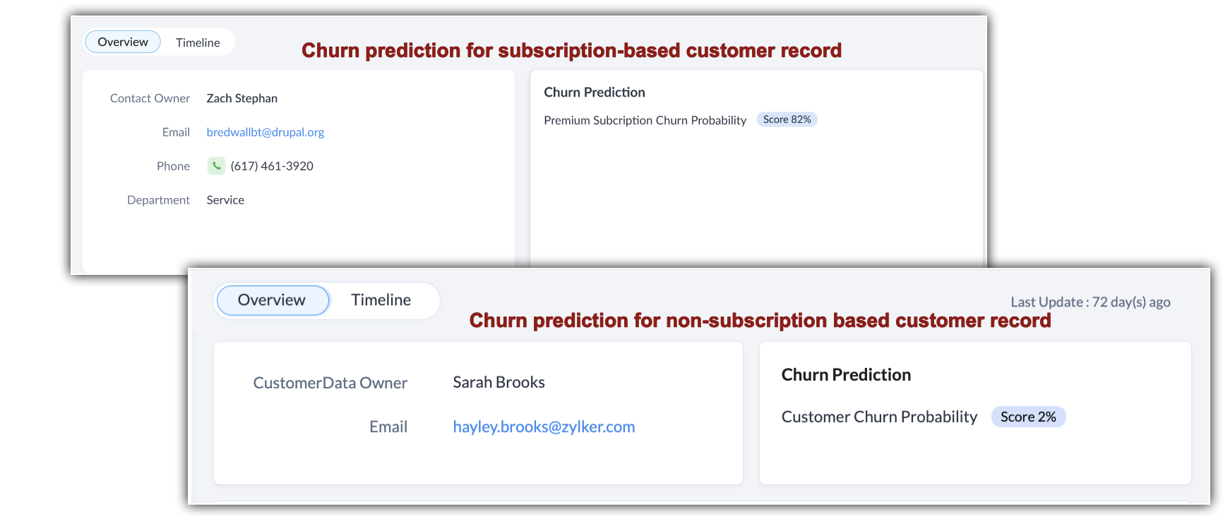 As you can see, for subscription-based customer record, Zia will display the churn score, product/ service they have subscribed to that is churning and for the record that is not subscription-based, Zia just displays the churn score, as the product cannot be ascertained like the former.