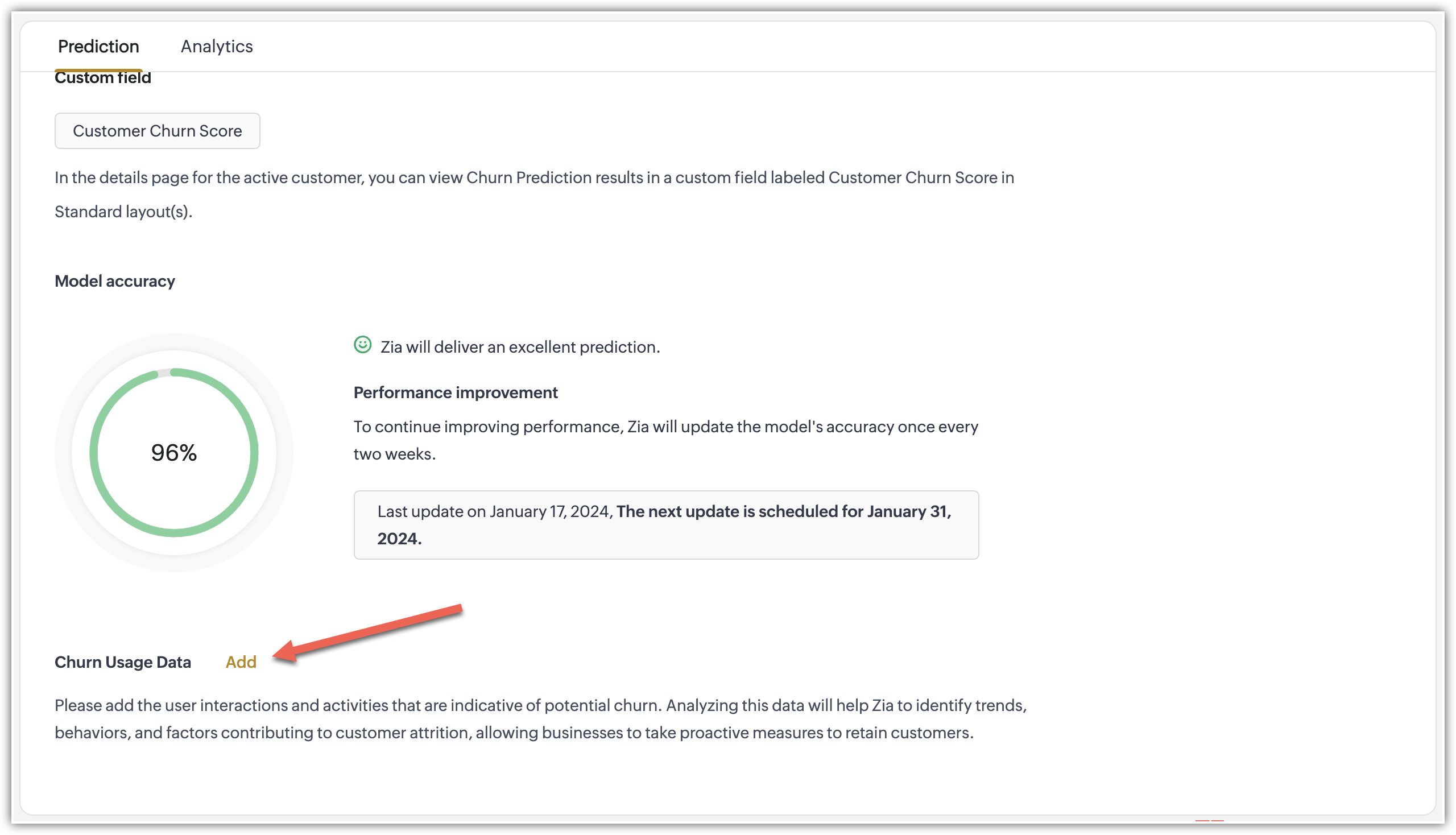 - Go to Setup > Zia > Prediction > Churn Prediction.