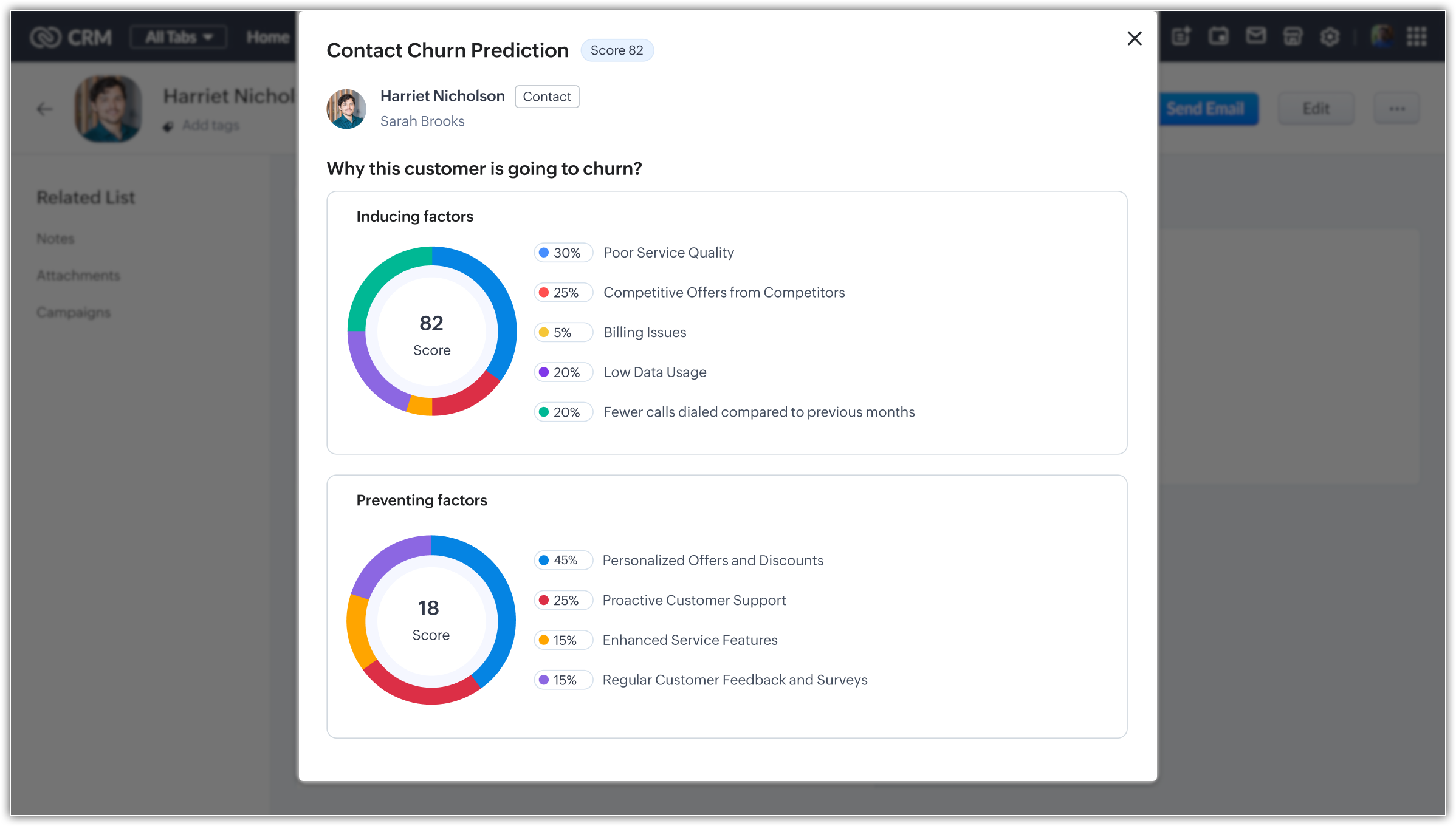The pop-up displays the proportionality of each reason's contribution to the prediction score. For instance, if poor service quality, competitive offers from competitors, and billing issues are the main reasons a customer might churn—the churn-inducing factors—the pop-up will indicate how much each of these factors has contributed to the predicted score. This adds a layer of transparency and enables you to understand the why behind churn predictions.