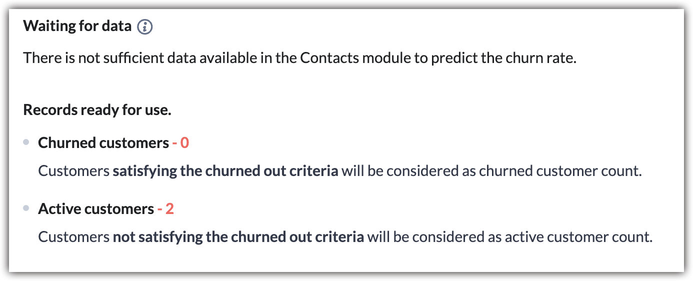 If you don't possess a sufficiently large data set yet, Zia will display the number of active customers and number of churned customers currently available in the customer module under the Waiting for data section. As mentioned above, Zia will need a minimum of 200 records to study and synthesize the prediction.