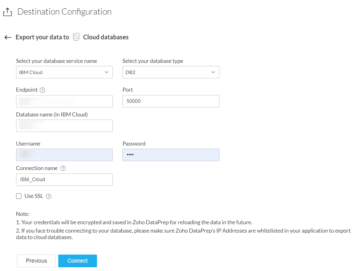Zoho DataPrep allows you to export data to IBM Cloud, a cloud database. IBM Cloud database solutions offer a complete portfolio of managed services for data and analytics.