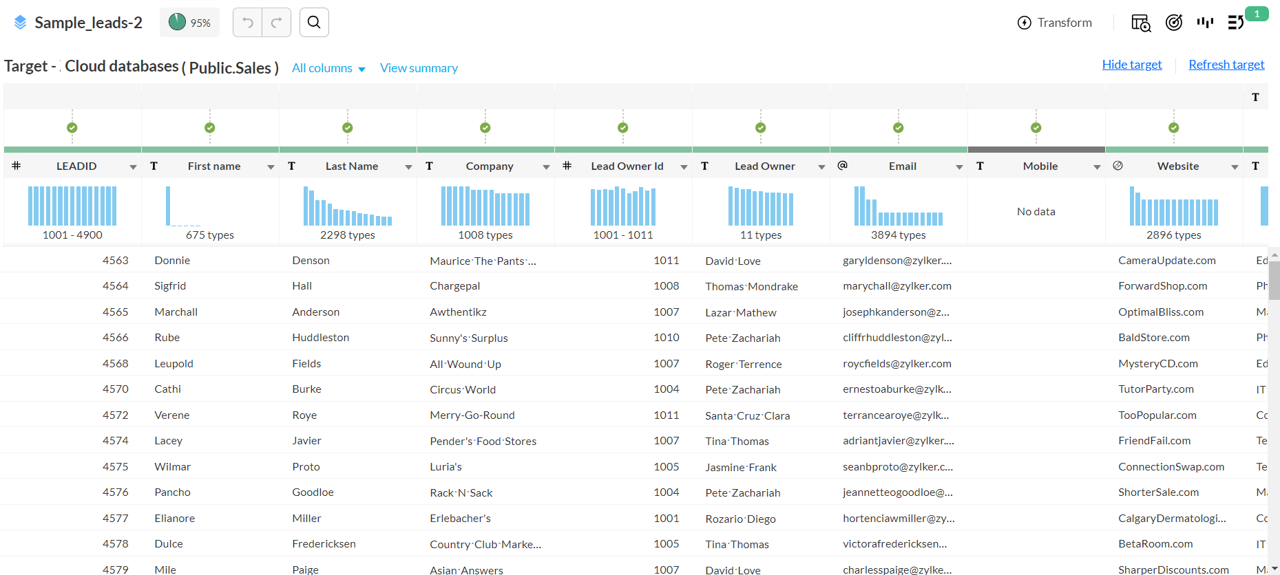 Target matching displays the different icons and suggestions on the matched and unmatched columns. You can click on these suggestions to quickly make changes to match the existing column with the target column. To make it easier for you to fix the errors, the target module in your cloud database is attached as a target to your data. You can view the mapping of your data with the table in the DataPrep Studio page along with the errors wherever there is a mismatch. You can hover over the error icons to understand the issue and click on them to resolve each error.