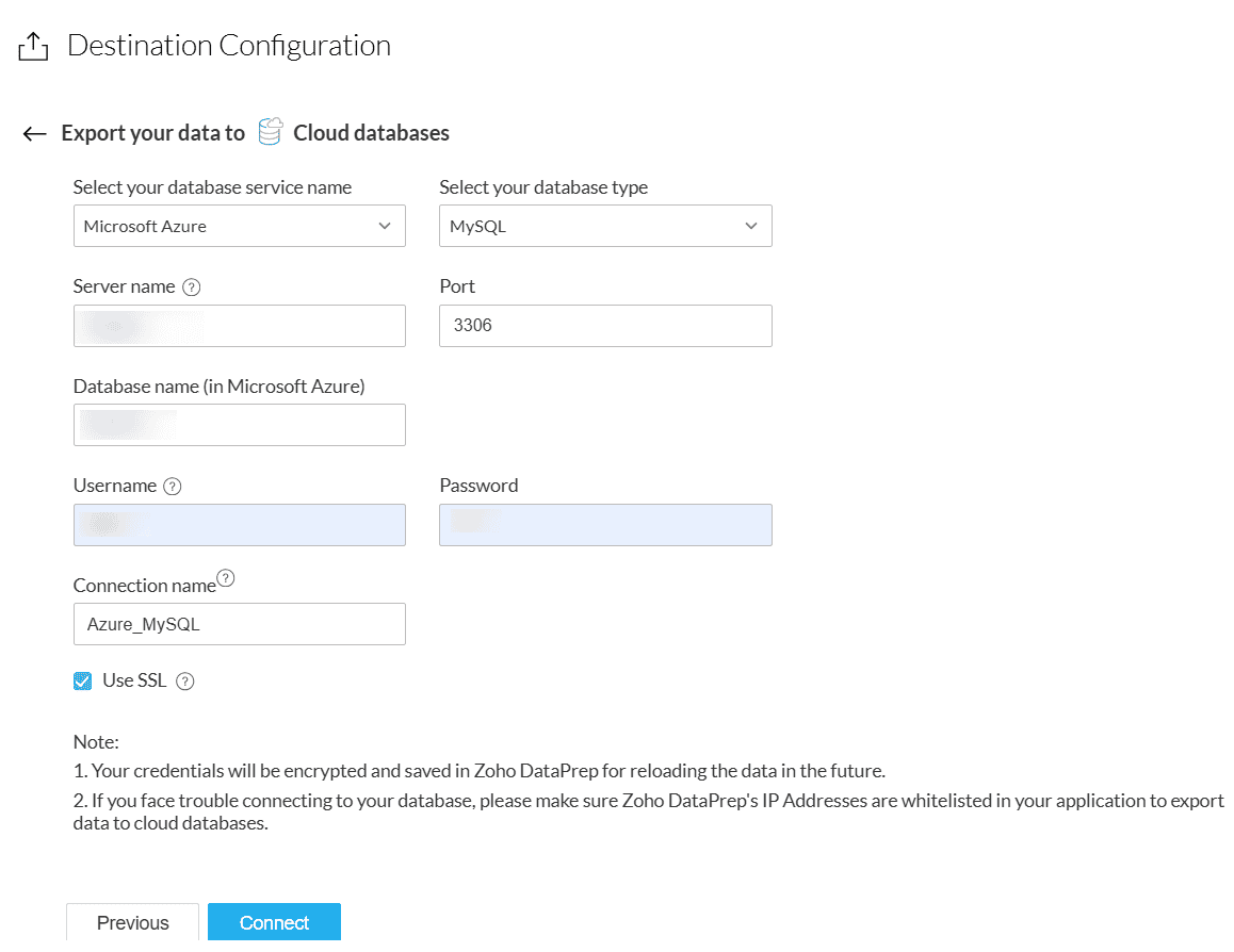 Note: If you face trouble connecting to your database, please make sure Zoho DataPrep's IP Addresses are whitelisted in your application to export data to cloud databases.