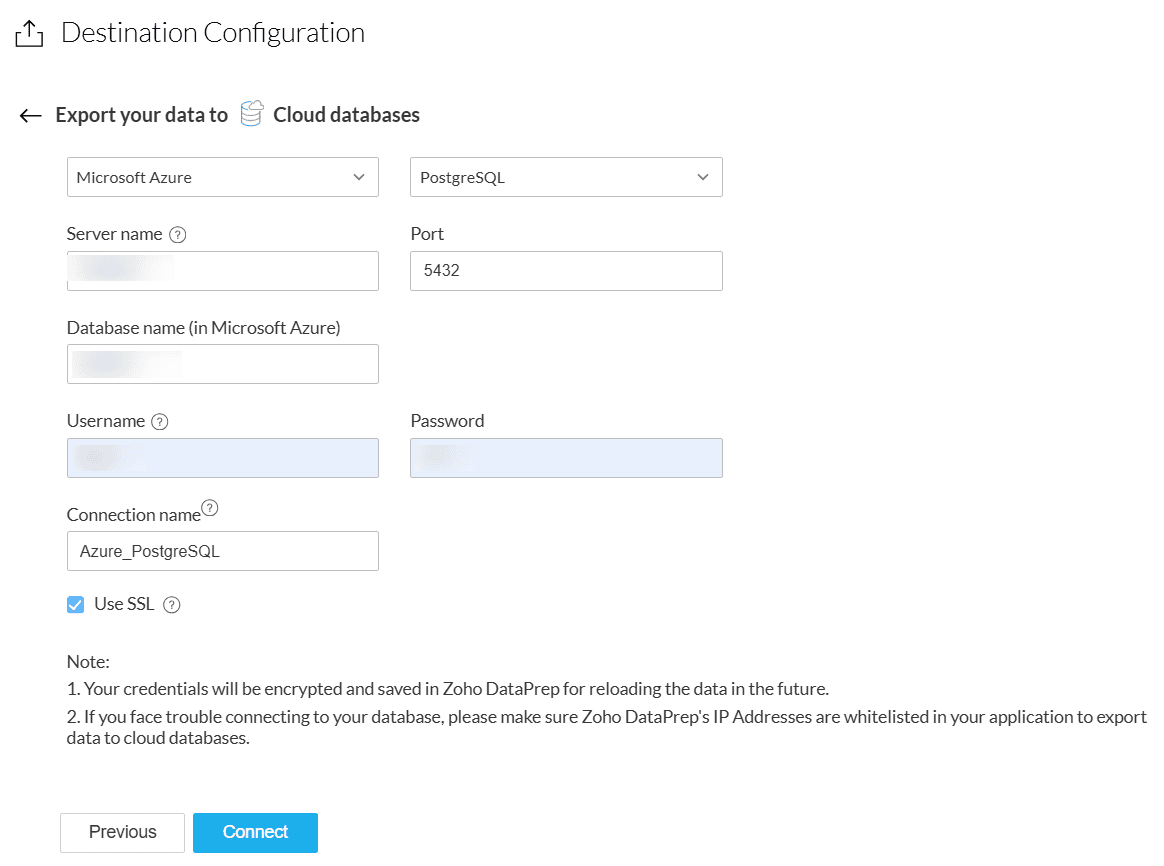 Note: If you face trouble connecting to your database, please make sure Zoho DataPrep's IP Addresses are whitelisted in your application to export data to cloud databases.
