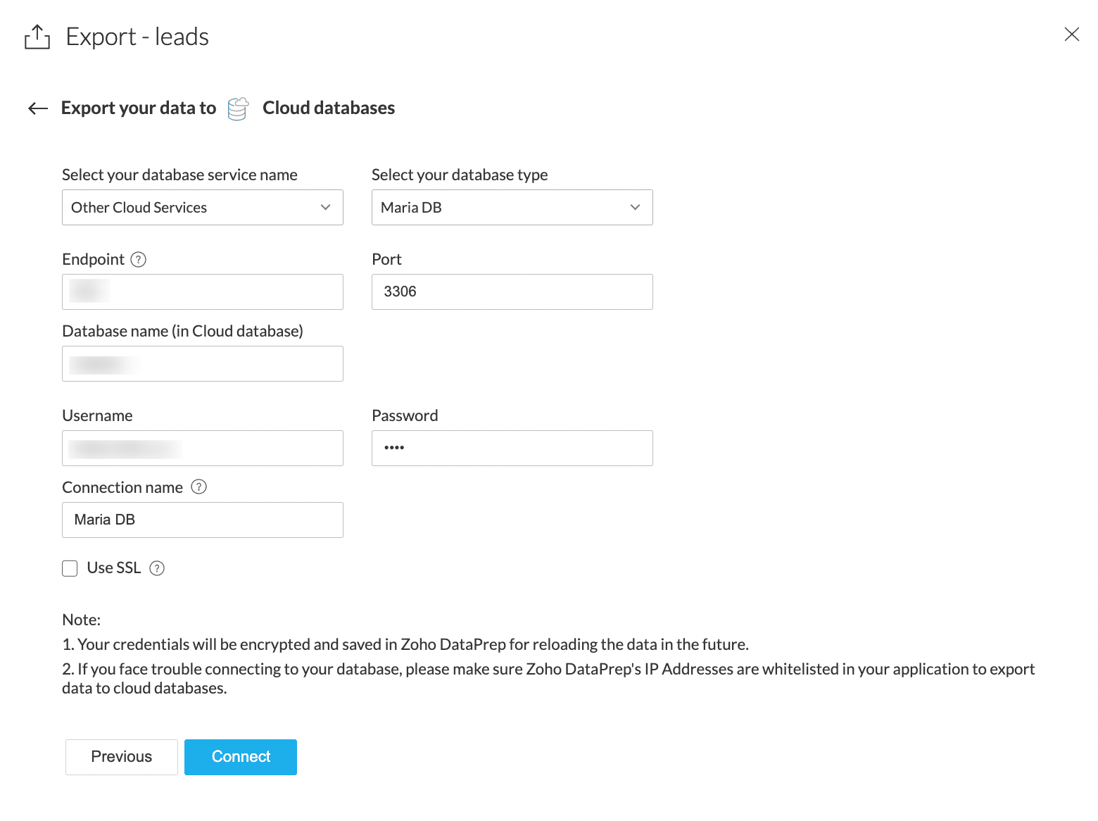 Note: If you face trouble connecting to your database, please make sure Zoho DataPrep's IP Addresses are whitelisted in your application to export data to cloud databases.