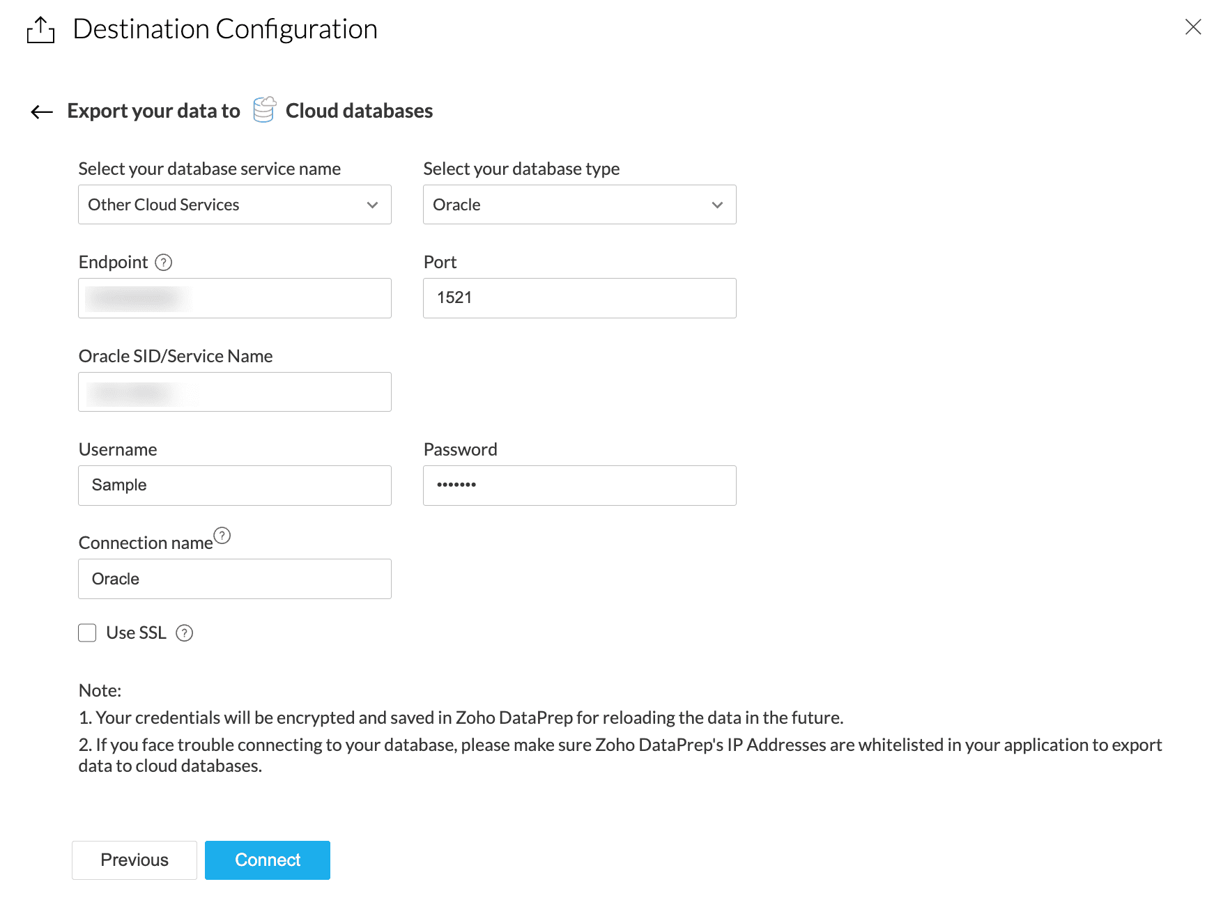 Note: If you face trouble connecting to your database, please make sure Zoho DataPrep's IP Addresses are whitelisted in your application to export data to cloud databases.