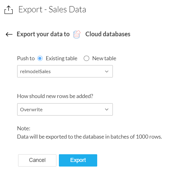11. If you select the Existing table option, there are two ways in which you can choose how to export the new rows from your dataset in DataPrep to the table in your database.