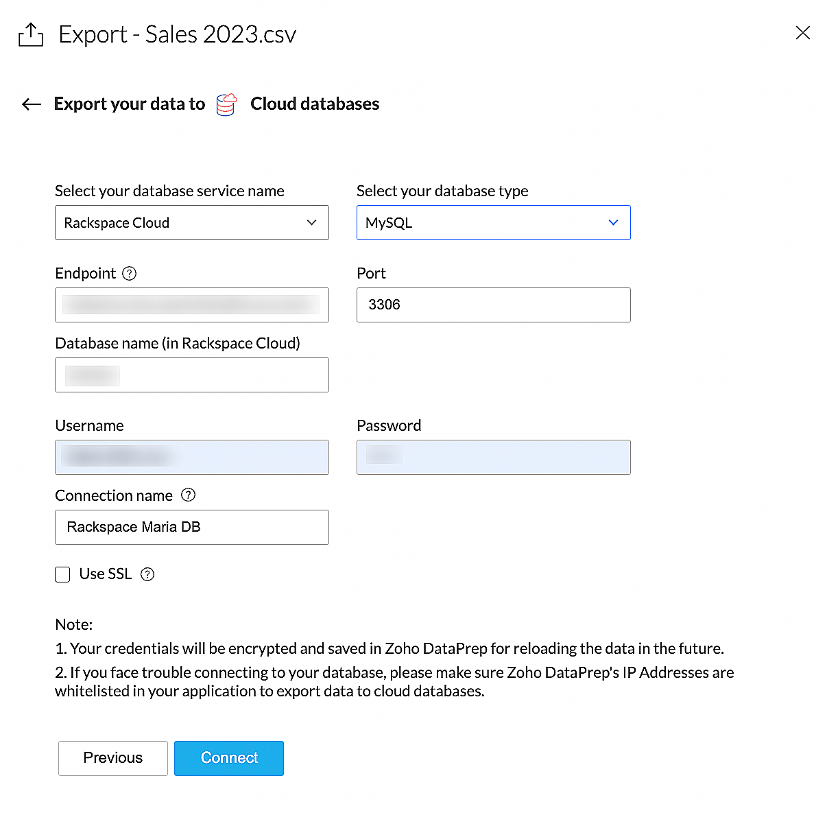 Note: If you face trouble connecting to your database, please make sure Zoho DataPrep's IP Addresses are whitelisted in your application to export data to cloud databases. Click here to know about Zoho DataPrep IP addresses.