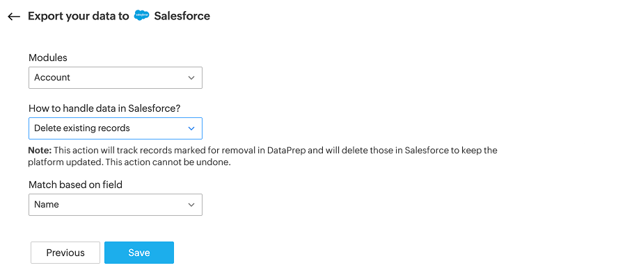 Delete existing records: This action tracks records marked for removal in DataPrep and deletes the corresponding records in Salesforce to keep the platform updated. This action cannot be undone.