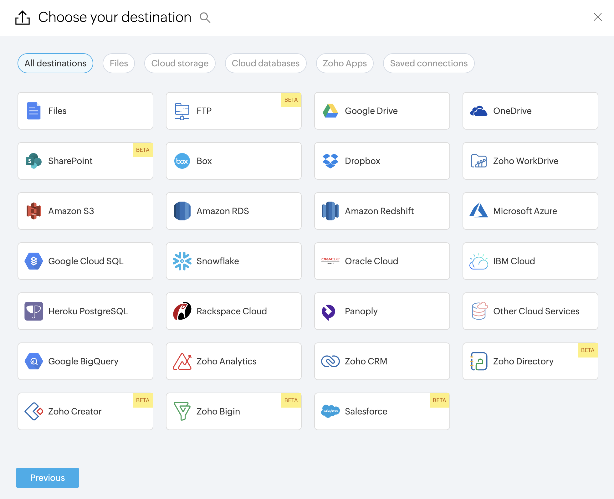 You can export your sales data from Zoho DataPrep to Salesforce using the Salesforce connector. With this connector, you can streamline your ETL workflows, enable smooth data movement, and simplify data integration between Salesforce and Zoho DataPrep.