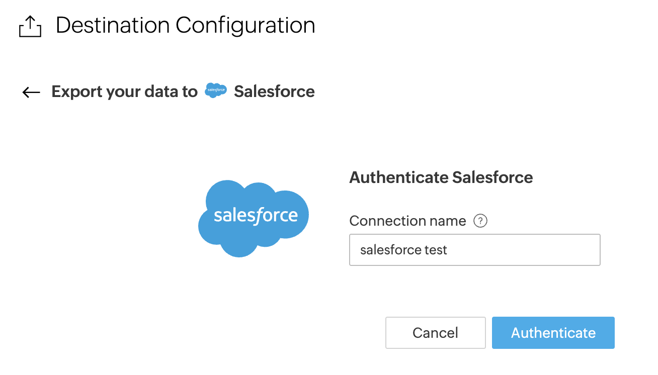 Note: The connection configuration will be saved for exporting to Salesforce in the future. Credentials are securely encrypted and stored.