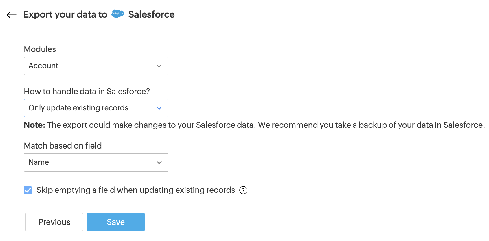 7. Choose one of the following options to determine how to handle the data being exported to Salesforce:
