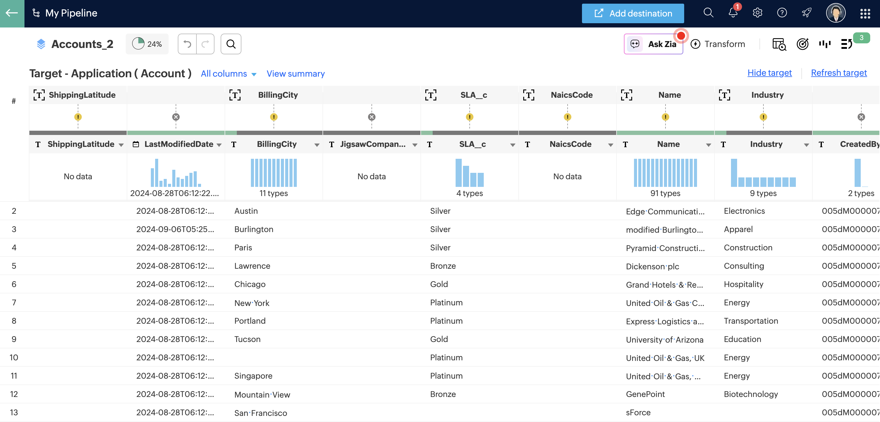 Target matching displays the different icons and suggestions on the matched and unmatched columns. You can click on these suggestions to quickly make changes to match the existing column with the target column. To make it easier for you to fix the errors, the target module in your Salesforce is attached as a target to your data. You can view the mapping of your data with the table in the DataPrep Studio page, along with the errors wherever there is a mismatch. You can hover over the error icons to understand the issue and click on them to resolve each error.