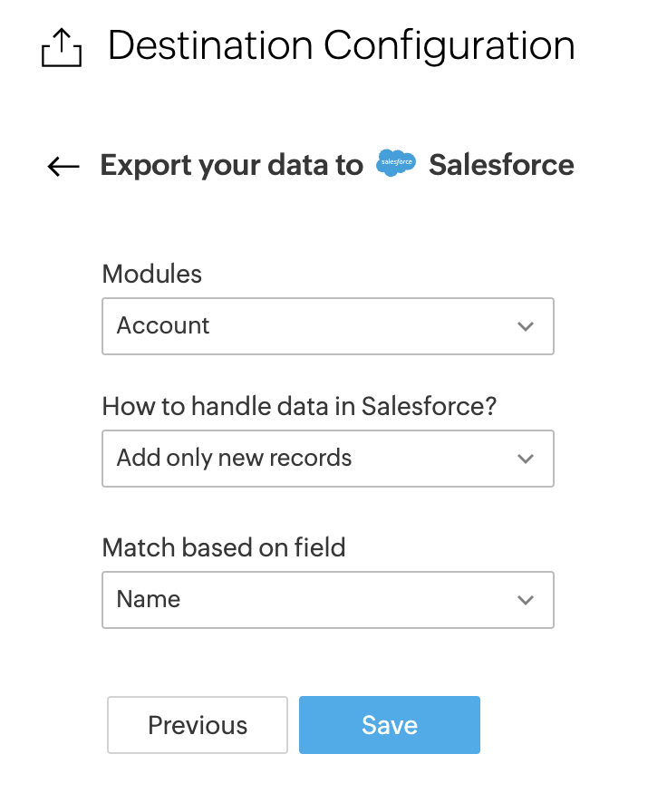 6. Choose the Module in Salesforce to which you want to export your data. You can export data to one of these modules in Salesforce.