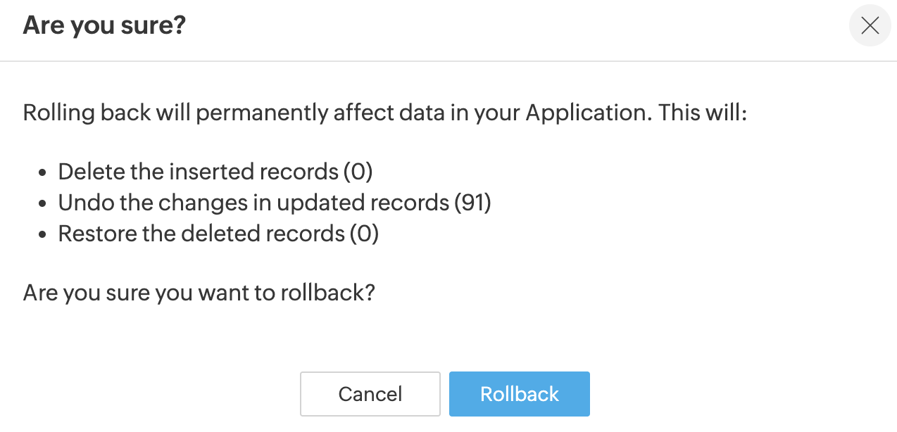 You can undo or cancel the changes made to your Salesforce module in case of partial export failures using the Rollback feature. Rollback will help you delete the inserted records, undo changes in the updated records, and restore the deleted records in your Salesforce module. Here's a quick video on Rollback export.
