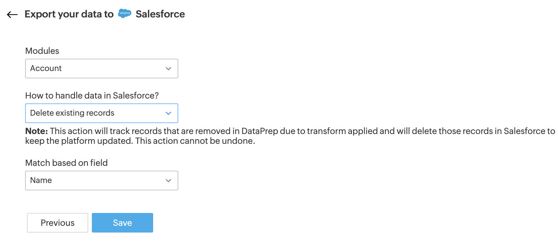 Delete existing records: This option will track records that are removed in DataPrep due to a transform applied and will delete those records in Salesforce to keep the platform updated. This action cannot be undone.