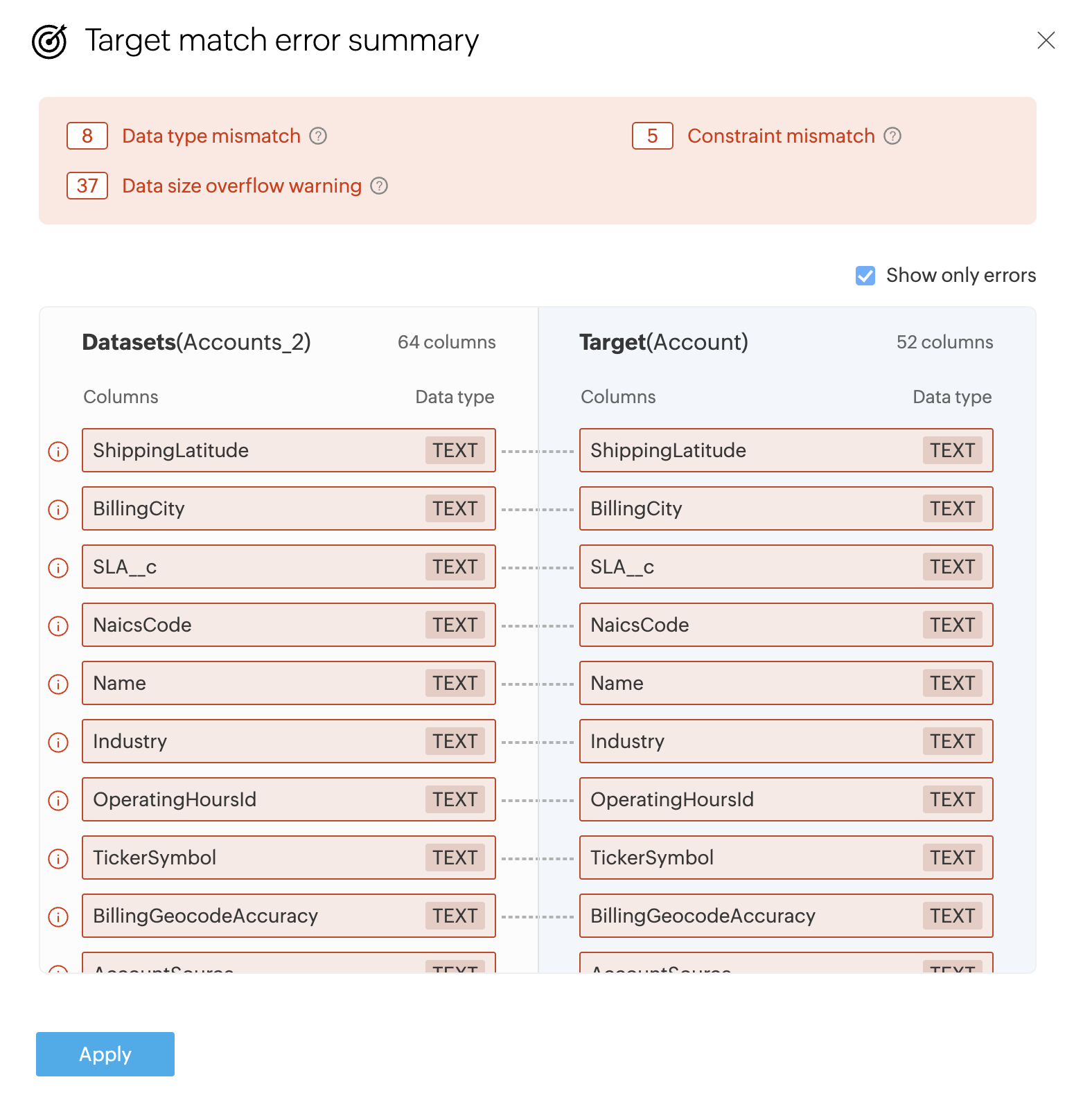 2. Click the View summary link to view the summary of the target match errors. The summary shows the different model match errors and the number of columns associated with each error. You can click on the required error columns and click Apply to filter out specific error columns.
