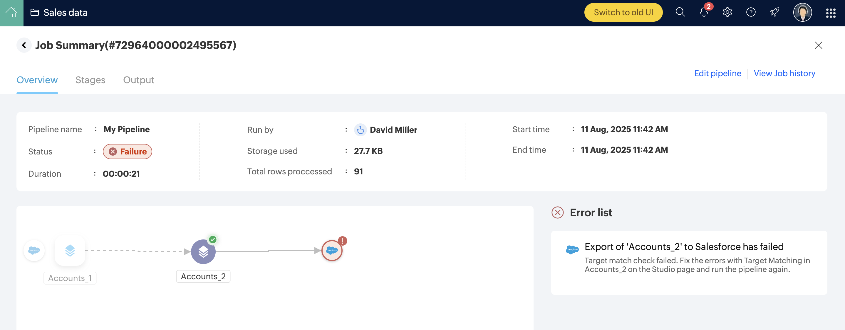 Info: Each run is saved as a job. When a pipeline run is executed, the data fetched from your data sources will be prepared using the series of transforms you have applied in each of the stages, and then the data will be exported to your destination. This complete process is captured in the