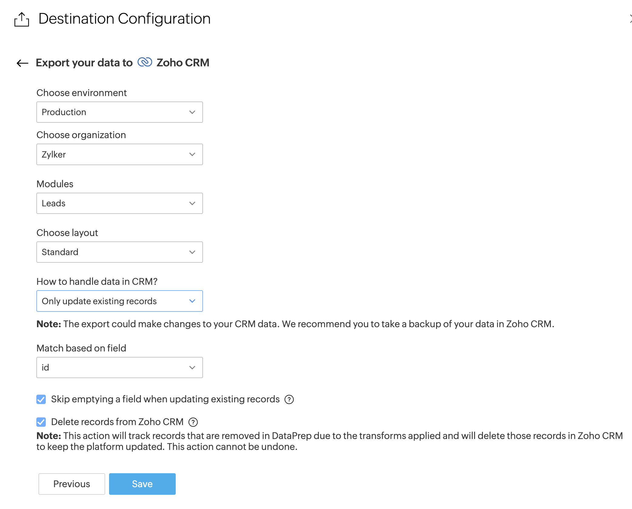 Note: If you are exporting data that was imported from any source other than Zoho CRM, make sure you select a value in the Match based on field manually.