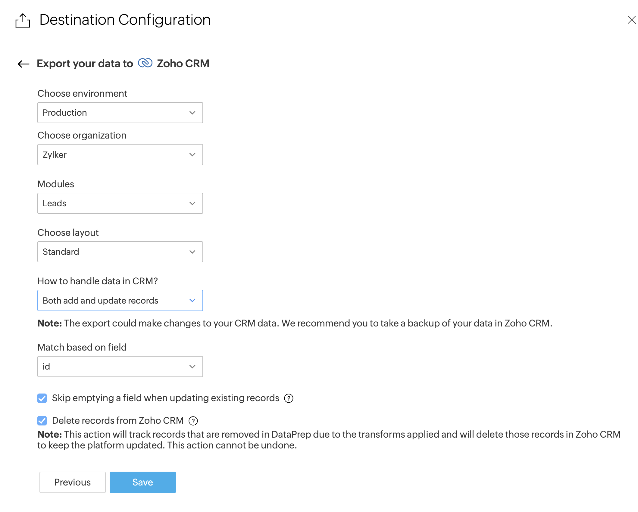 You can export your sales data from Zoho DataPrep to Zoho CRM using the Zoho CRM connector. You can use Zoho DataPrep to perform