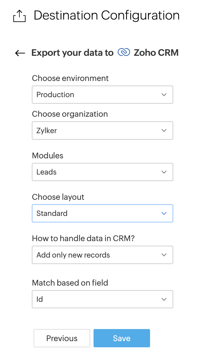 6. Choose the Layout in Zoho CRM to which you want to export your data.