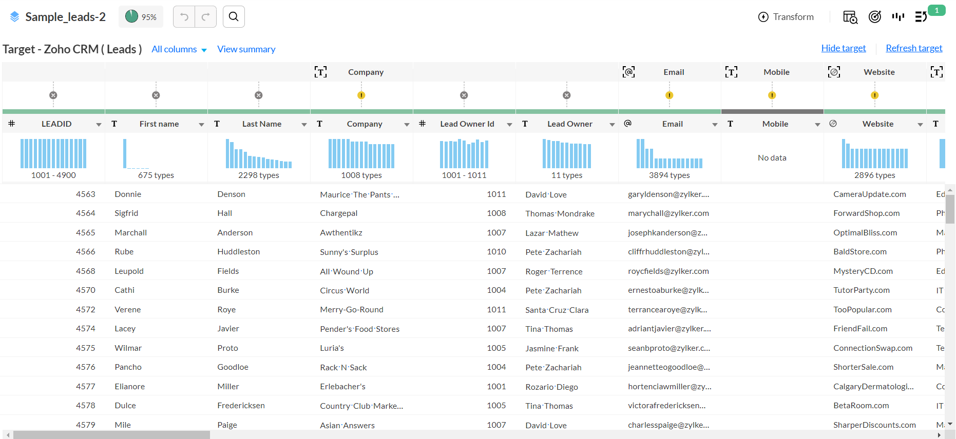 Target matching displays the different icons and suggestions on the matched and unmatched columns. You can click on these suggestions to quickly make changes to match the existing column with the target column. To make it easier for you to fix the errors, the target module in your CRM is attached as a target to your data. You can view the mapping of your data with the table in the DataPrep Studio page along with the errors wherever there is a mismatch. You can hover over the error icons to understand the issue and click on them to resolve each error.