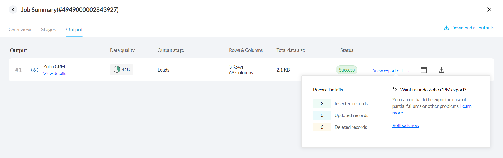 In case of partial export failures, you may choose to undo or cancel the changes done to Zoho CRM using the Rollback now feature. You can rollback even a successful export if you want to.