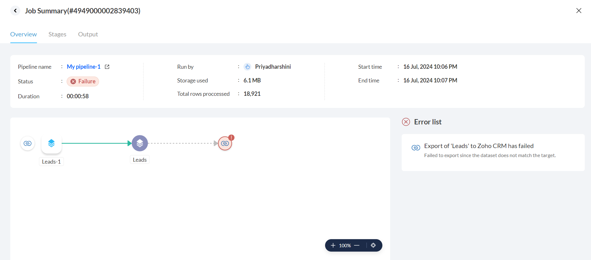 Info: Each run is saved as a job. When a pipeline run is executed, the data fetched from your data sources will be prepared using the series of transforms you have applied in each of the stages, and then the data will be exported to your destination. This complete process is captured in the