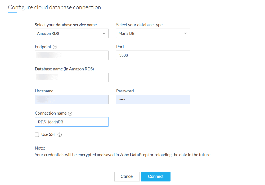 5. You can also select the Use SSL checkbox if your database server has been setup to serve encrypted data through SSL.