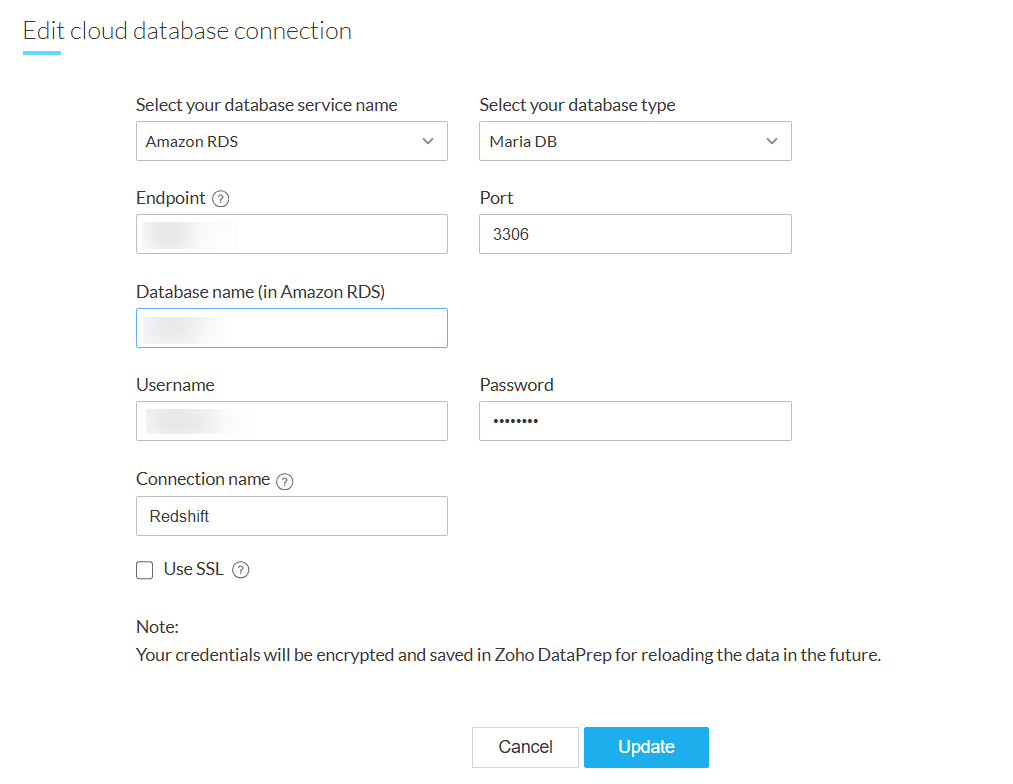 DataPrep saves your data connections to avoid the hassle of keying in the credentials every time you need to connect to a data source or destination. You can always edit the saved data connection and update them with new parameters or credentials using the Edit connection option.