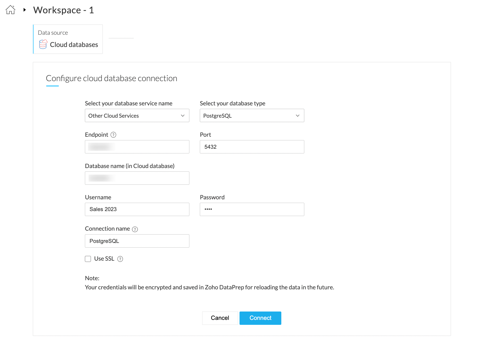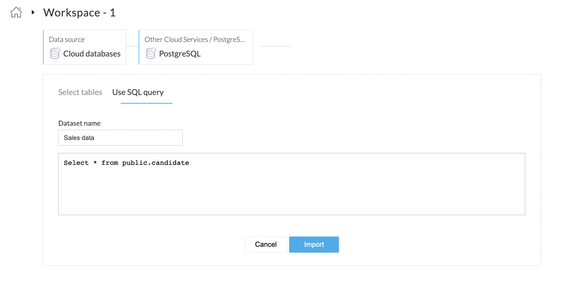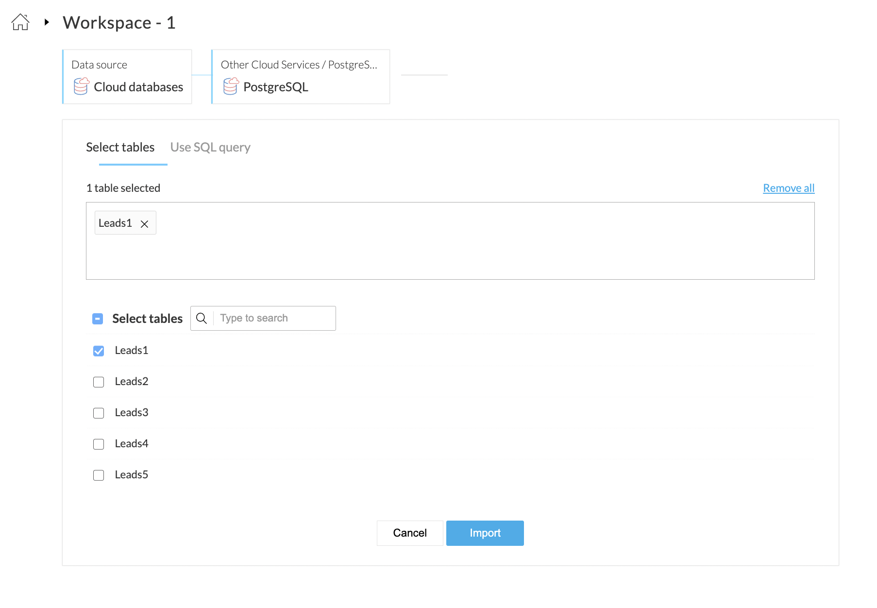 Note: If you had already added Other Cloud Services - PostgreSQL connection, choose the required connection under the Saved connections category and proceed to import. To learn more about Saved connections, click here.