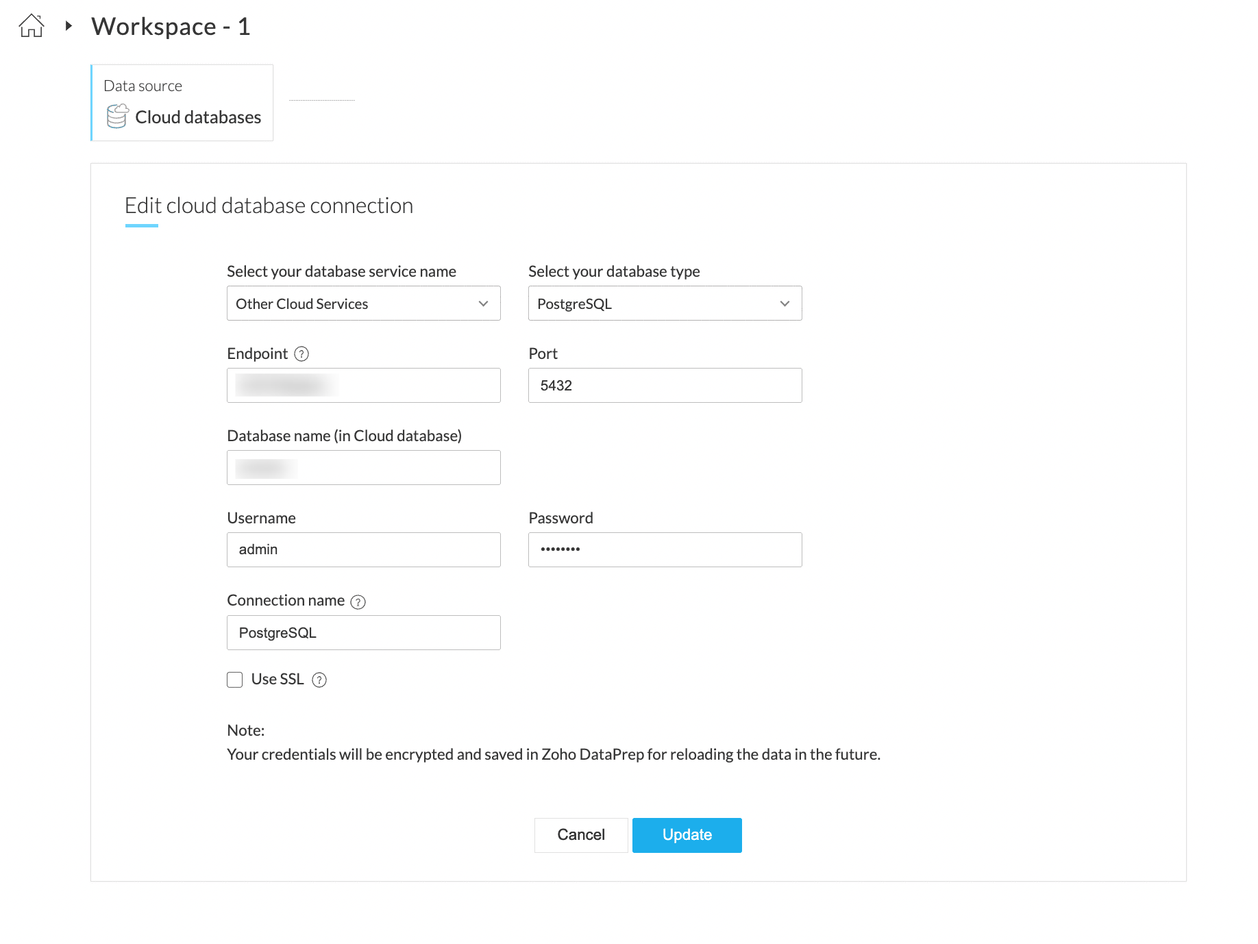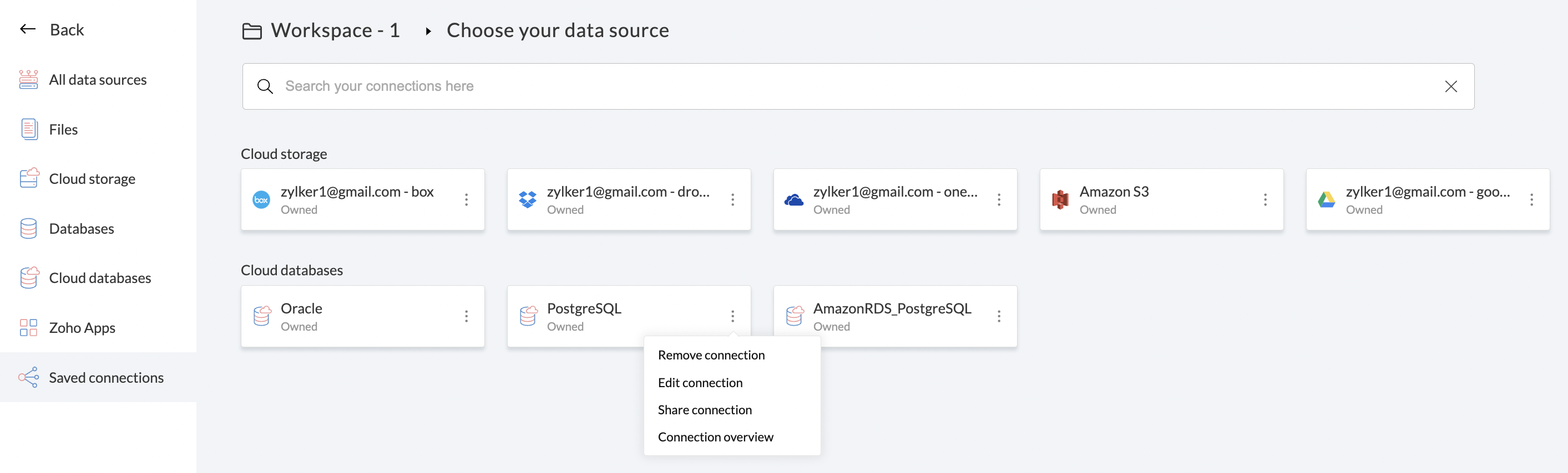 DataPrep saves your data connections to avoid the hassle of keying in the credentials every time you need to connect to a data source or destination. You can always edit the saved data connection and update them with new parameters or credentials using the Edit connection option.