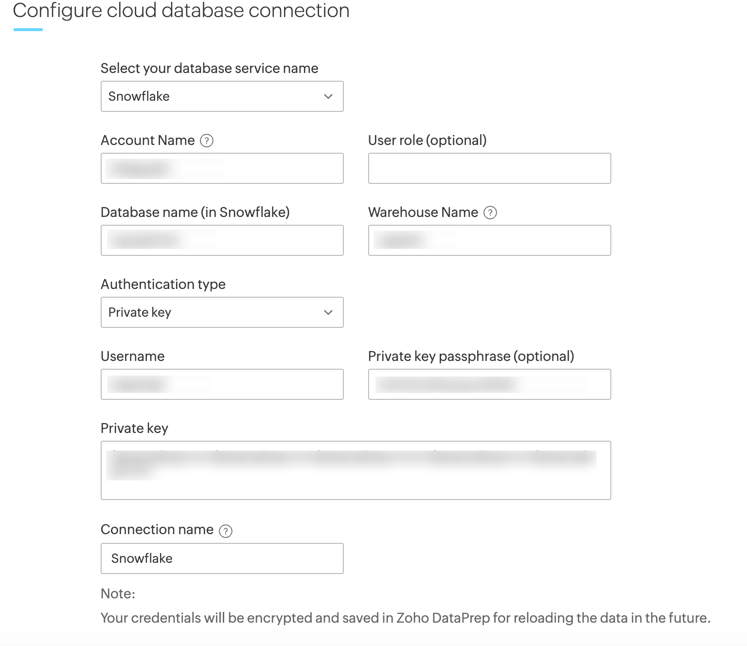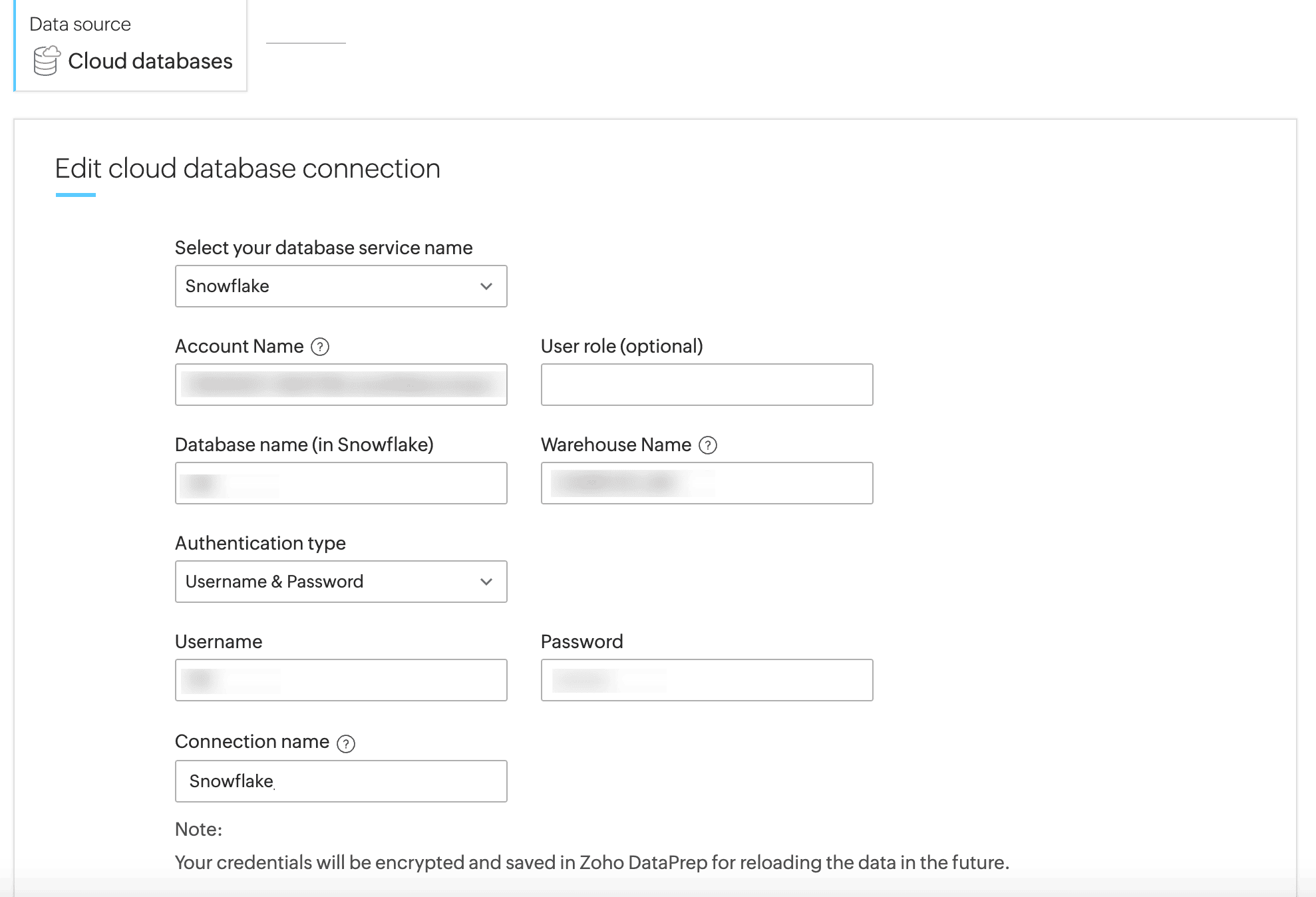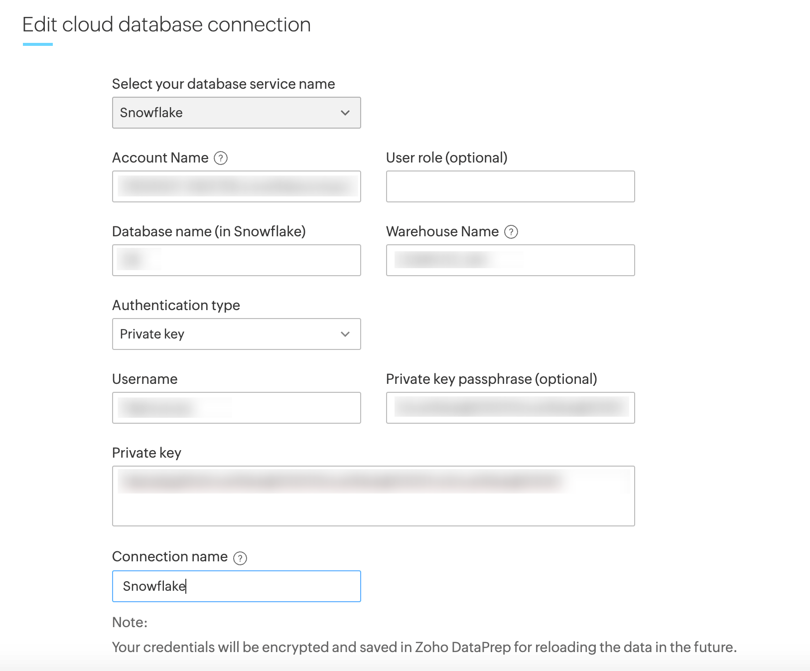 Your existing connections will continue to work till November 2025. By November 2025, Snowflake will officially block all sign-ins that rely on single-factor authentication with passwords. So please update your existing connections with the new authentication methods in Zoho DataPrep to ensure continued access and enhanced security.