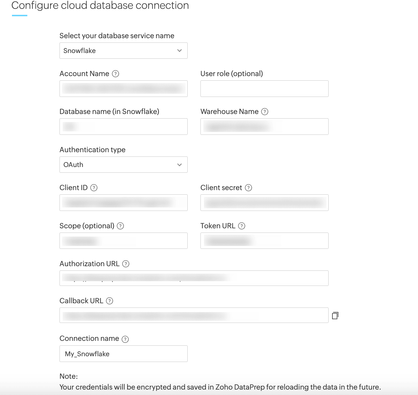 Callback URL - OAuth2.0 redirects back to this URL. Copy and paste this URL in your application for successful authorization. This is generated while you create a Snowflake connection in DataPrep.