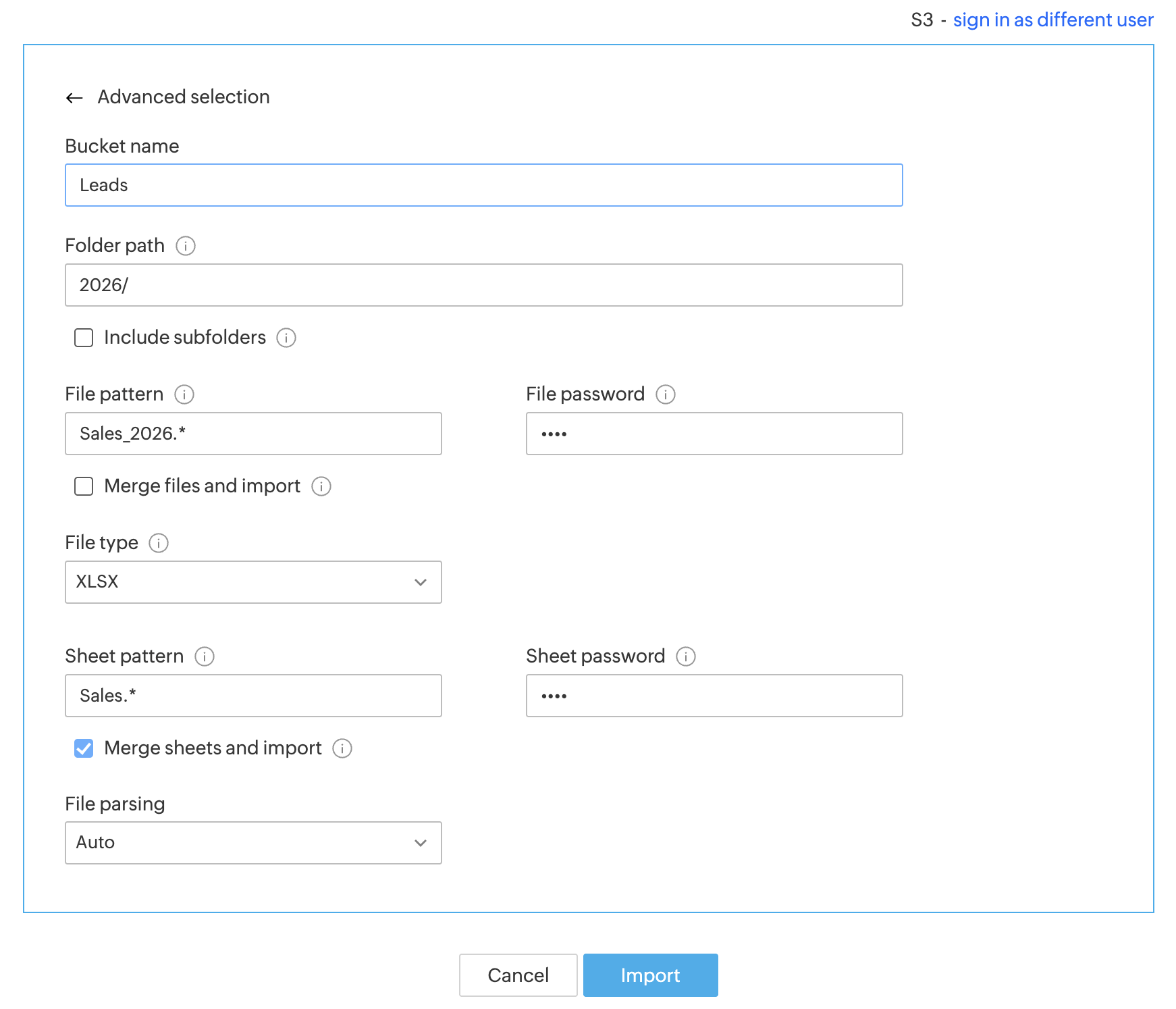 Bucket name : The bucket name you want to import data from.