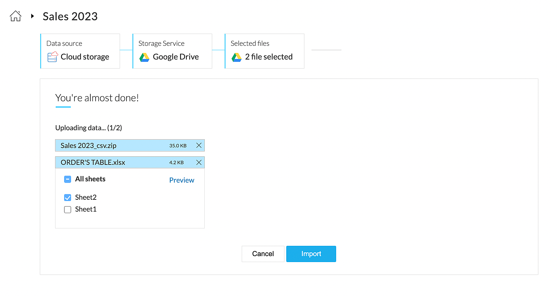 Note: If this checkbox is unchecked then, only 1 sheet will be fetched at a time. 3. Click the Import button.