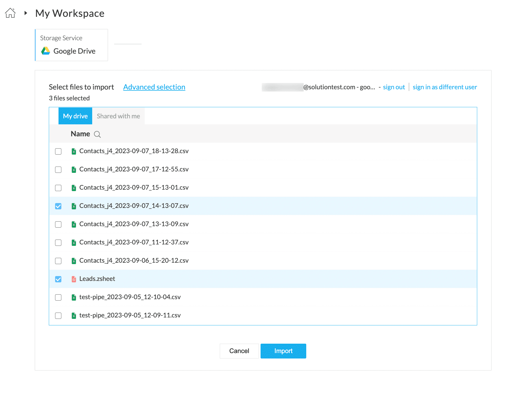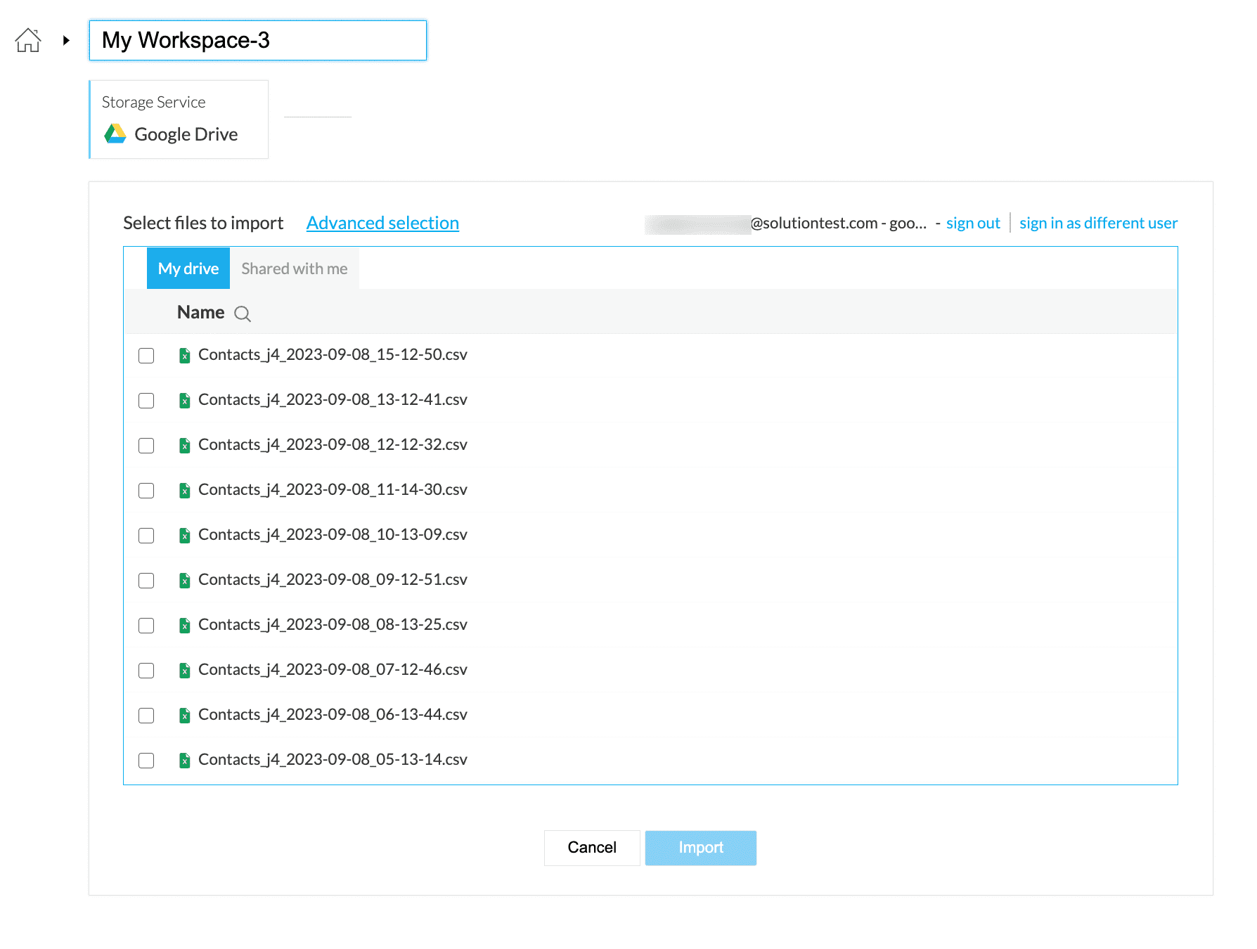 5. Select the files you want to import and click the Import button. You can also select files from the Shared with me tab. You can also use the Advanced selection option to import files that match a specific pattern. Click here to know more.
