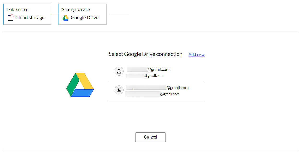 Note: Click the Add new link to add a new Google Drive account. You can create as many Google Drive connections as required.