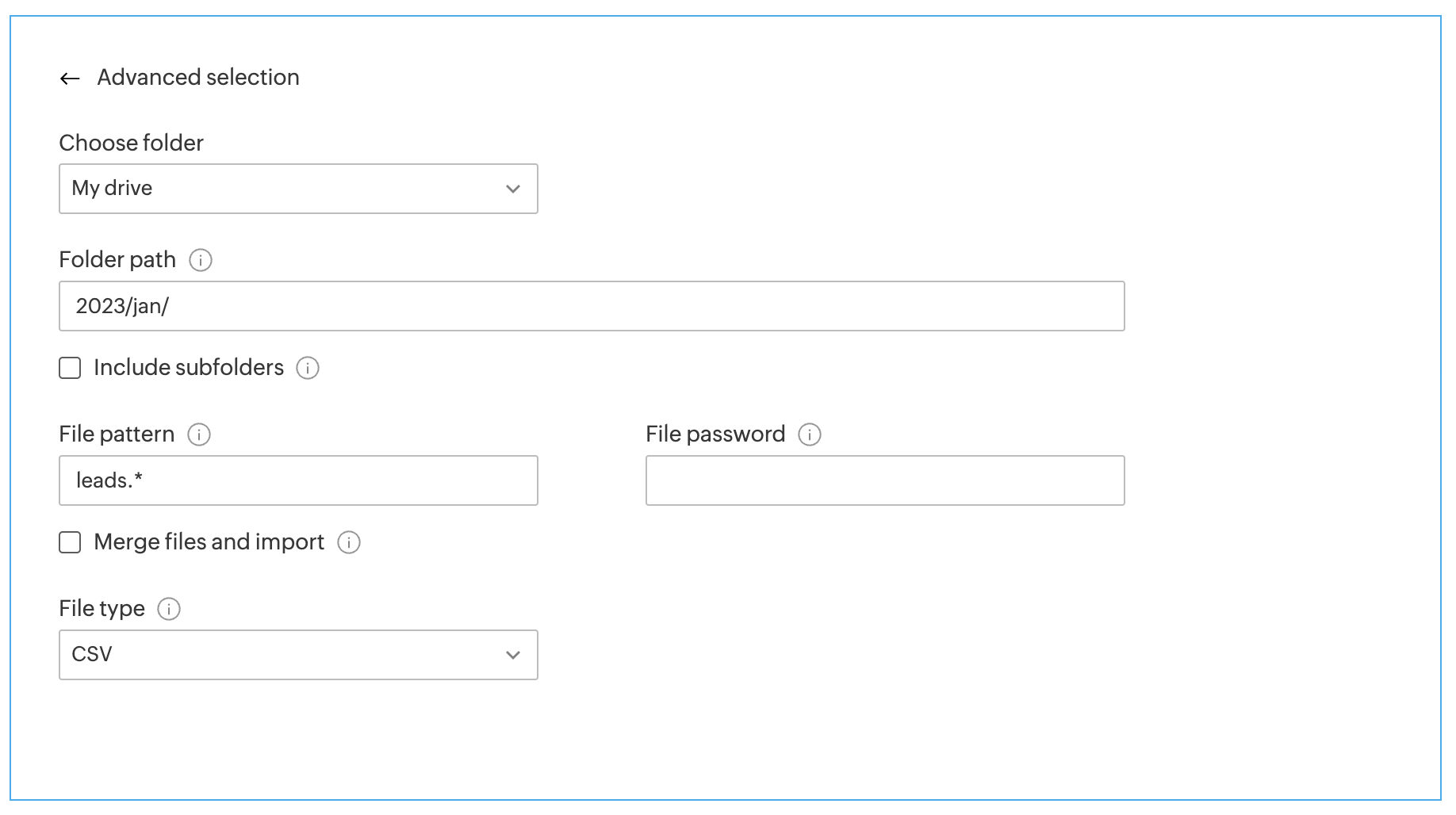 Important: Advanced selection is used not only for incremental fetch. You can also use this option for bulk import of files based on the file pattern.