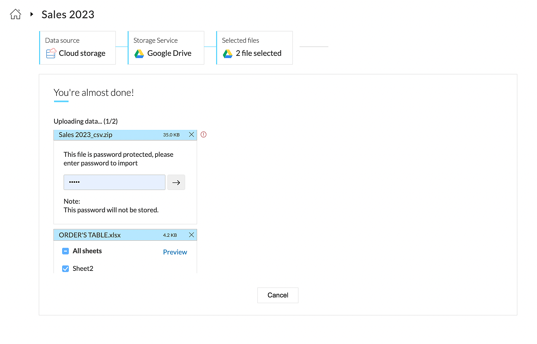 Note: The connection configuration will be saved for importing from the Google Drive in the future. Credentials are securely encrypted and stored.