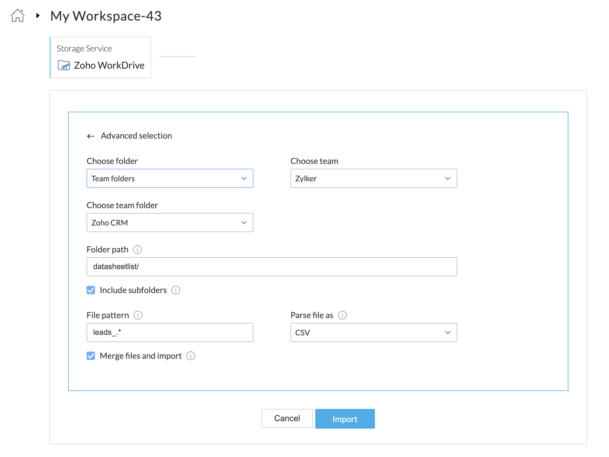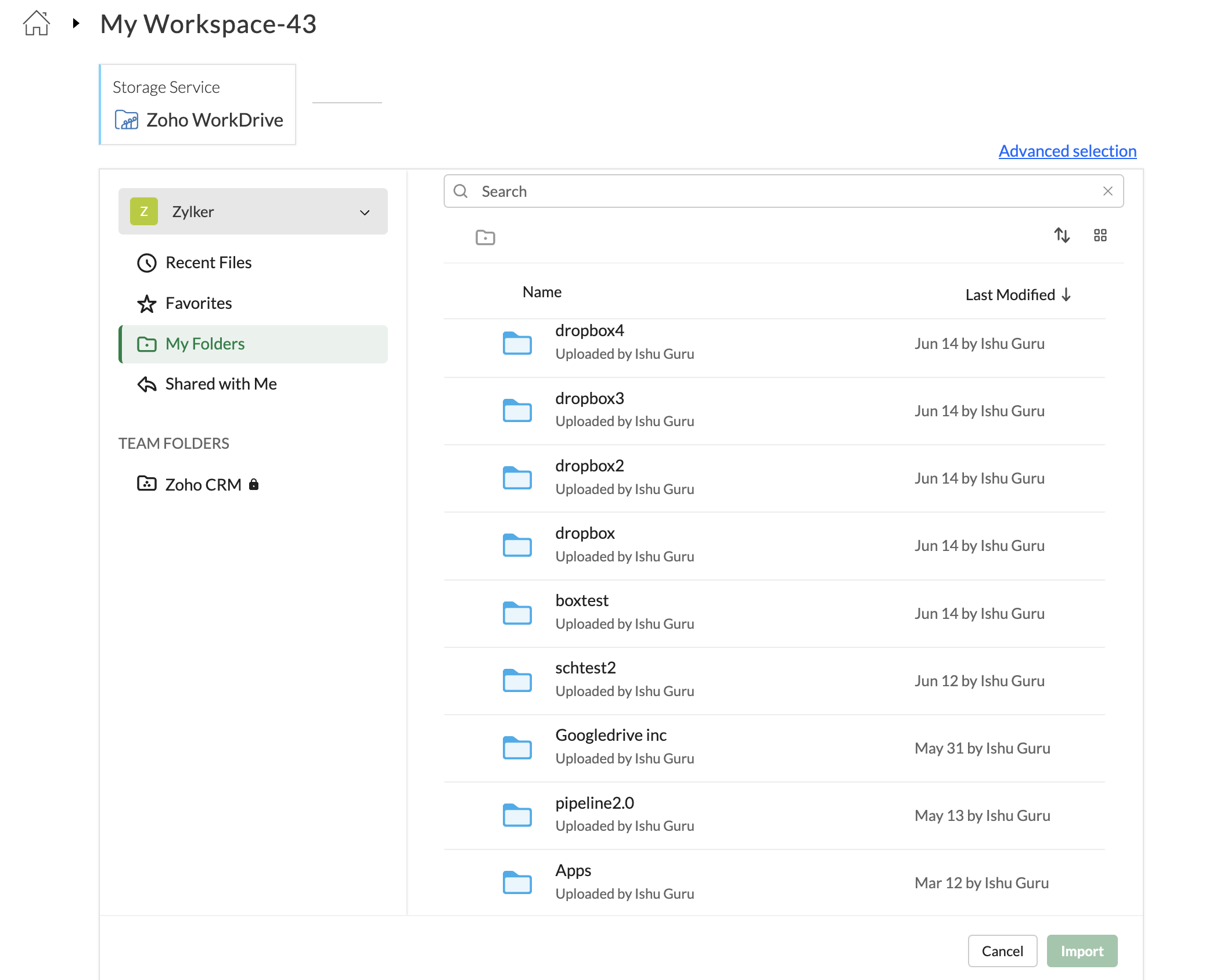 3. All the folders and files in your WorkDrive will be directly fetched from your Zoho WorkDrive account using which you have logged into Zoho DataPrep. Select the files you want to import and click the Import button. You can also use the Advanced selection option to import files that match a specific pattern. Click here to know more.