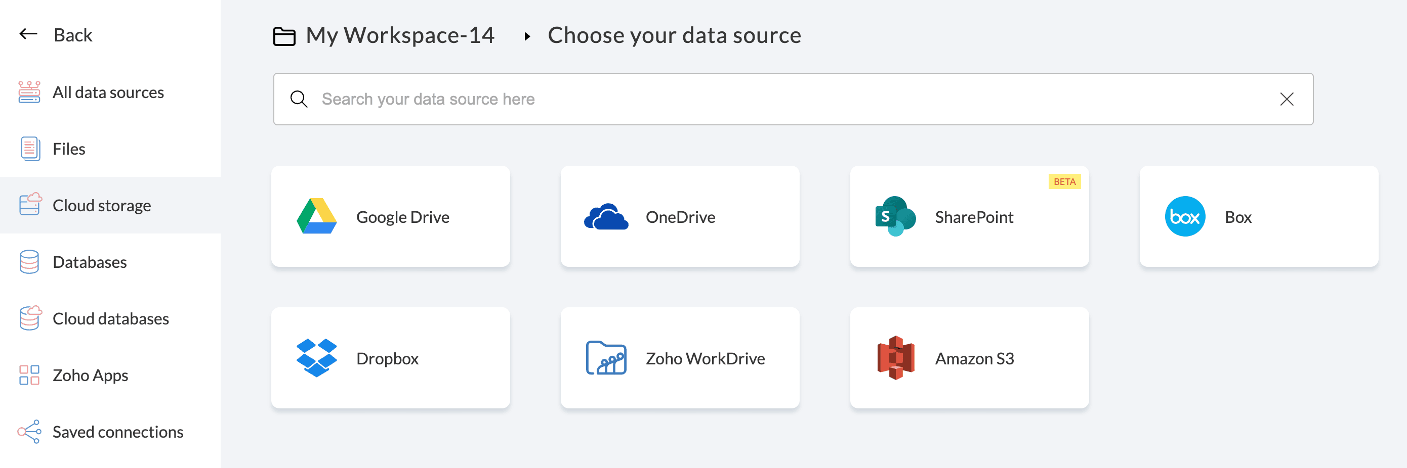 Info: For Zoho WorkDrive, data will be directly fetched from your WorkDrive account using which you have logged into Zoho DataPrep.