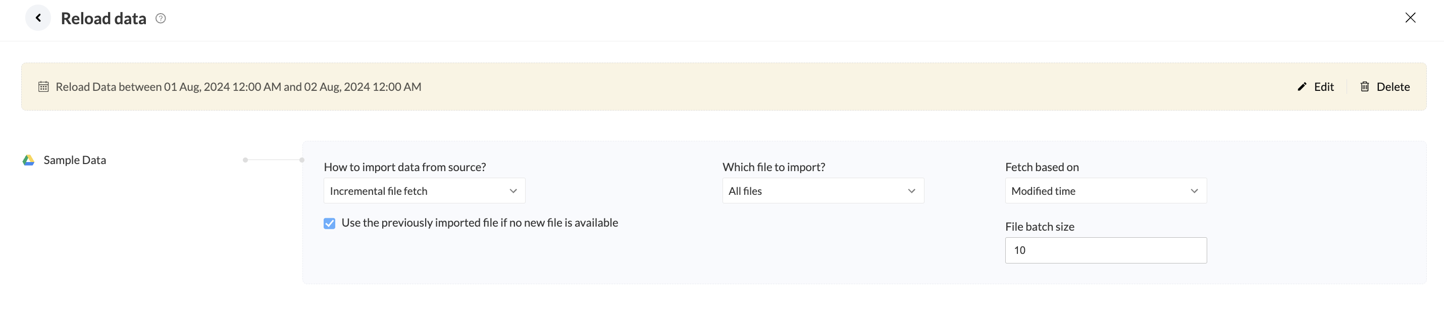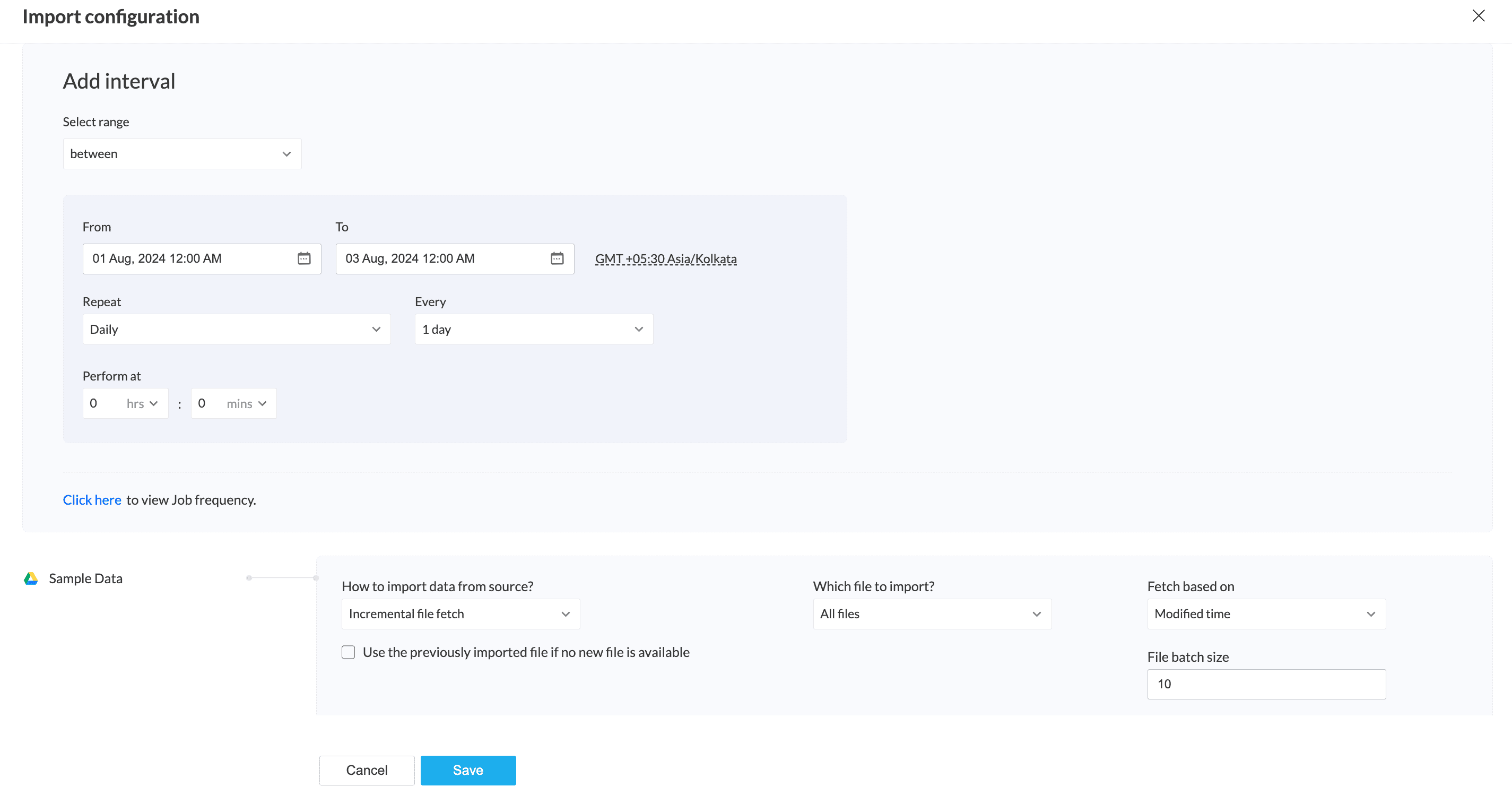 You can configure how to import and fetch incremental data from your source using the Import configuration option. Incremental data import is a method used to import new or modified records in the specific data interval.
